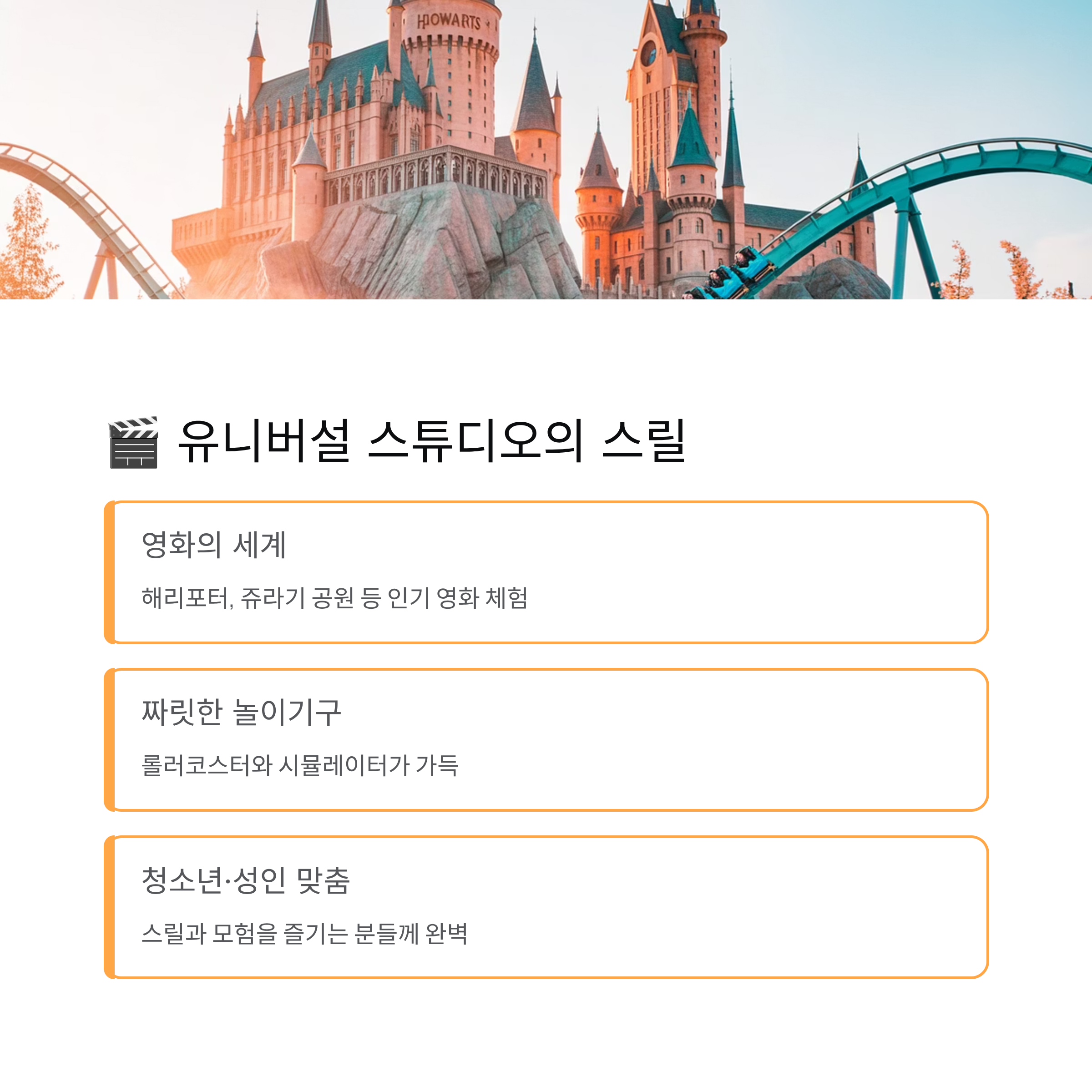 - 유니버설 스튜디오: 스릴을 좋아하는 청소년·성인, 영화 마니아