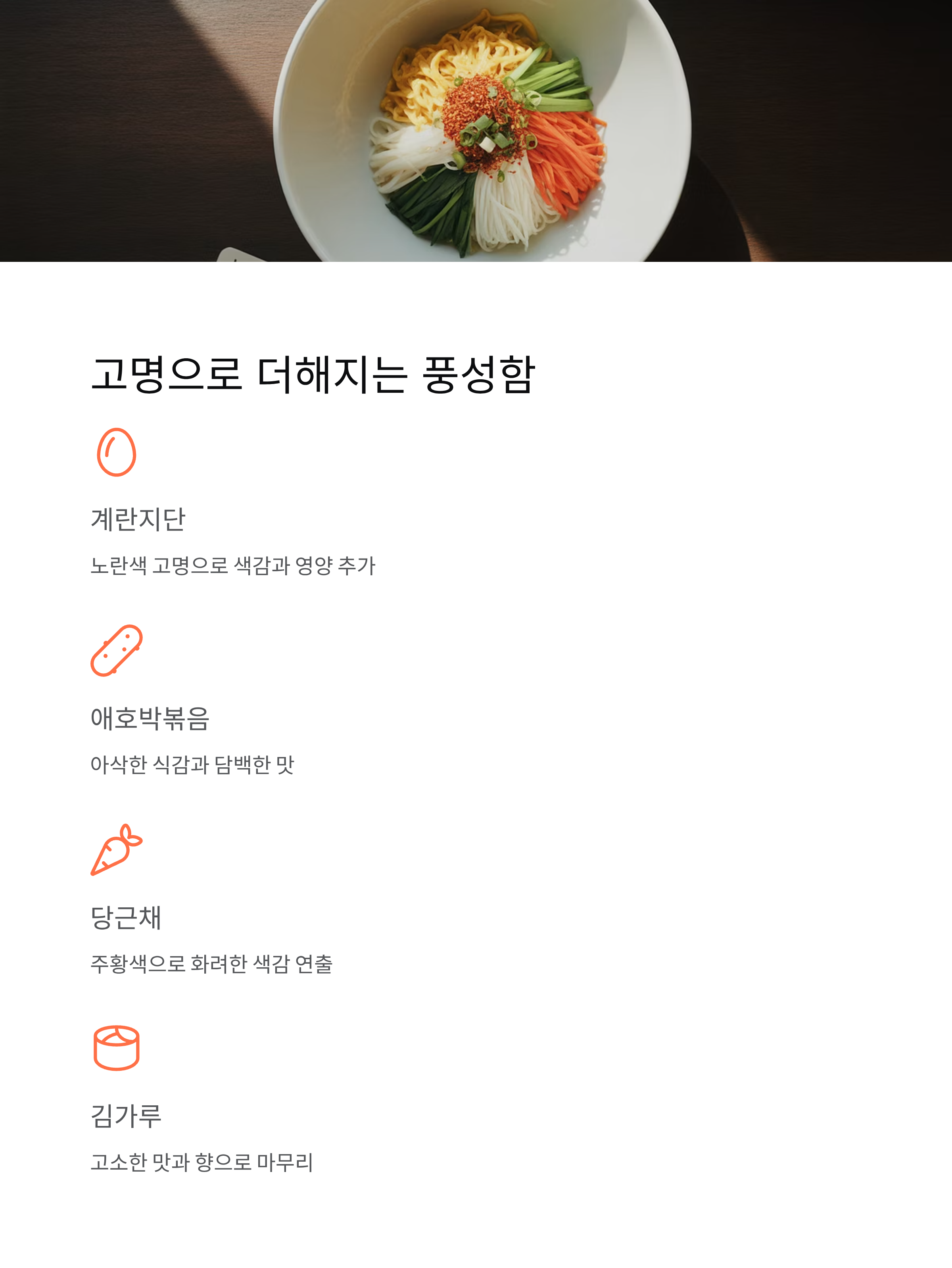 기본 육수와 양념장만 있어도 충분하지만, 고명이 곁들여지면 한층 더 정성스러운 국수가 됩니다.