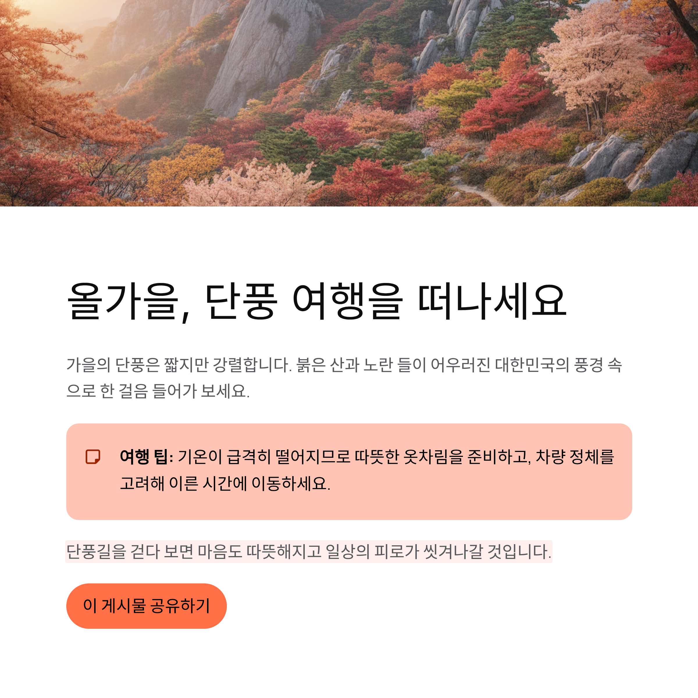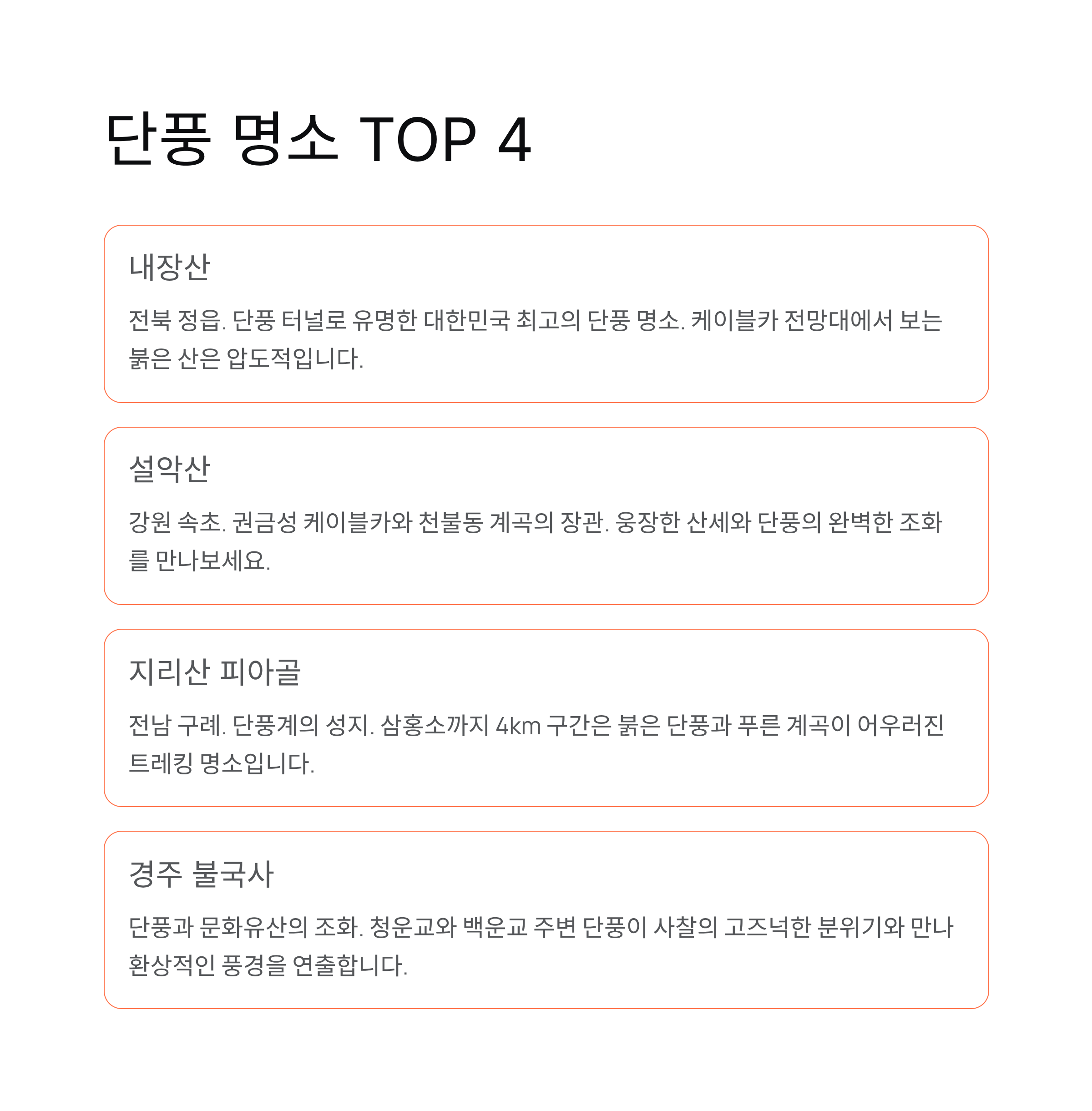 | 🍁 2025 가을 단풍 명소 BEST 10 — 놓치면 후회할 전국 단풍 여행지 총정리 (1) | 2025.10.25 |