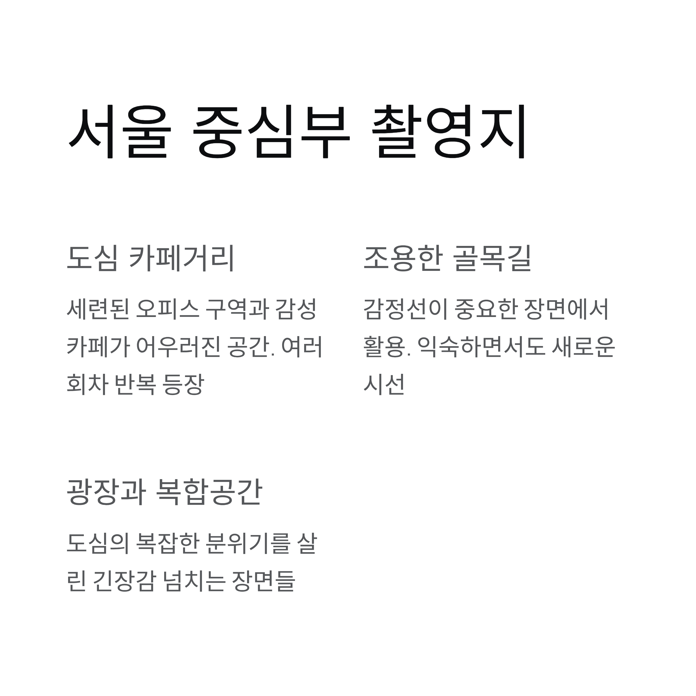 서울은 드라마의 주요 배경으로 꾸준히 등장했어요. 도심의 복잡한 분위기와 깔끔한 오피스 구역이 잘 활용되면서 장면마다 다른 느낌을 만들어줍니다. 카페 거리와 광장, 골목길이 다양하게 쓰여 익숙하면서도 새로운 시선으로 표현되었죠. 여러 회차에 반복적으로 등장한 곳도 있어 스토리의 흐름과 자연스럽게 이어졌습니다.