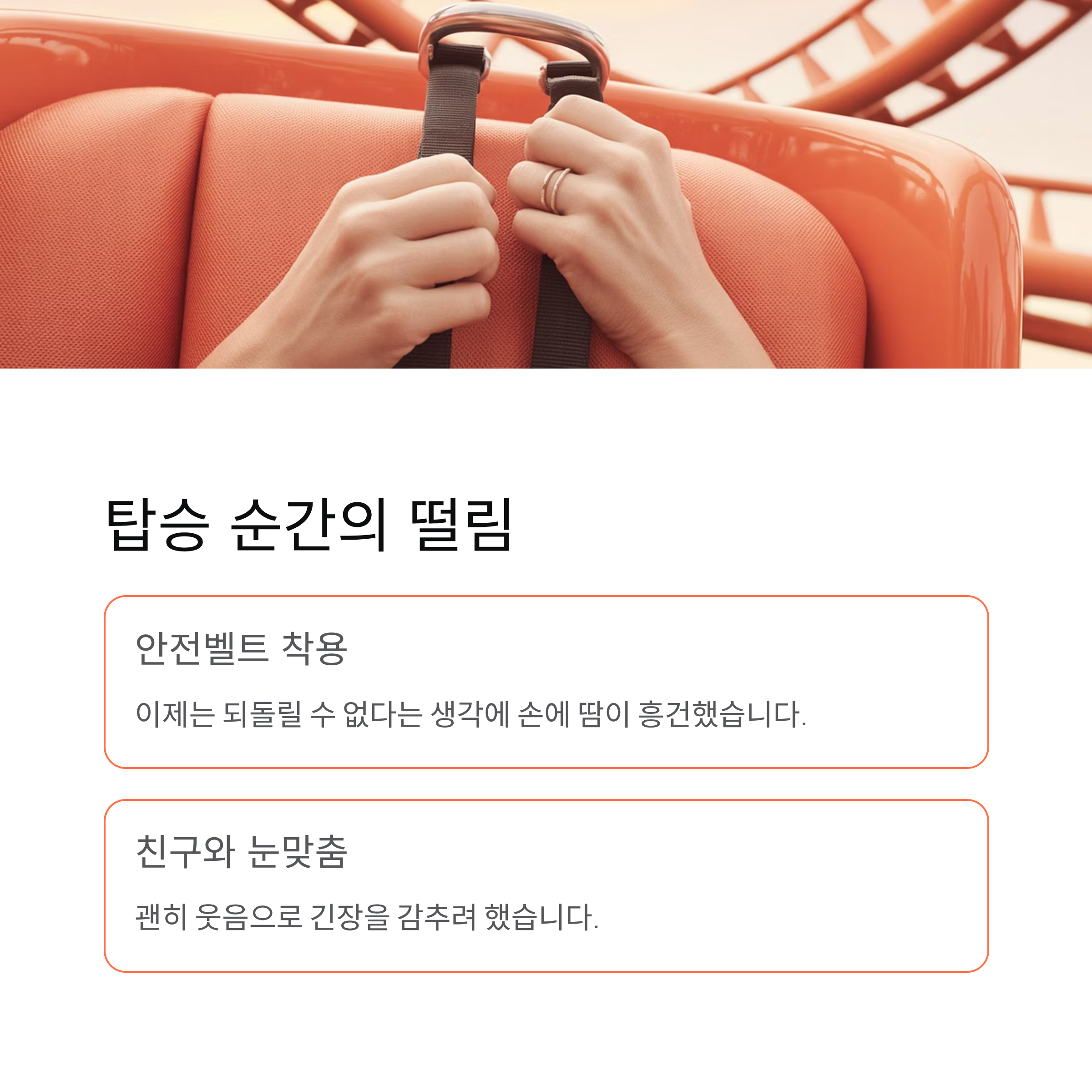 안전벨트와 어깨 보호대를 착용하는 순간, 이제는 되돌릴 수 없다는 생각에 손에 땀이 흥건했습니다.