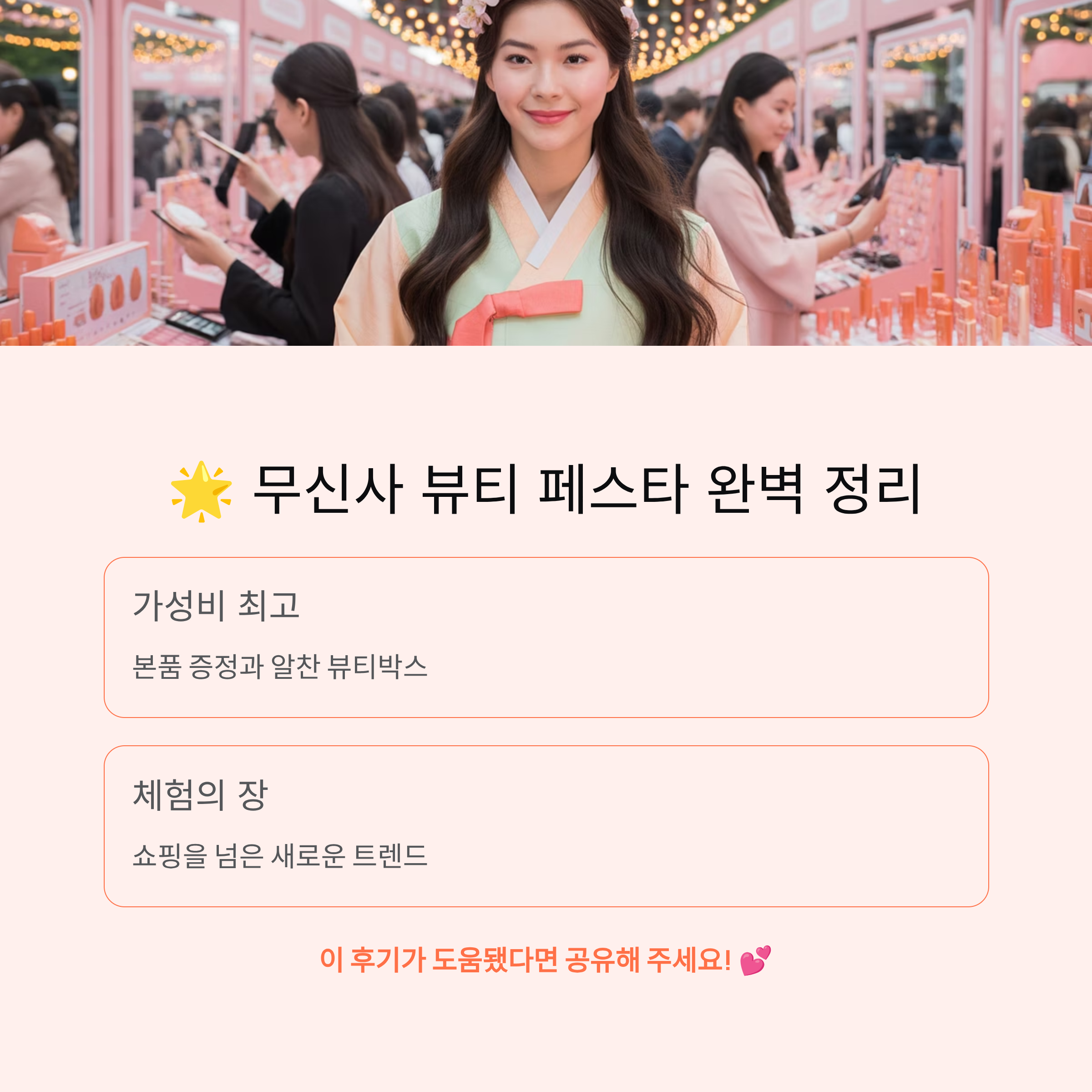 2025 무신사 뷰티 페스타 미디어데이는 단순한 쇼핑을 넘어 ‘체험과 혜택’을 동시에 잡을 수 있는 자리였습니다. 본품 증정 부스와 알찬 뷰티박스 구성은 관람객의 만족도를 극대화했고, 미션 이벤트와 SNS 참여는 또 다른 재미를 선사했습니다. 뷰티와 패션의 경계가 허물어지는 지금, 무신사 뷰티 페스타는 새로운 쇼핑 트렌드를 보여준 행사로 기억될 것입니다.