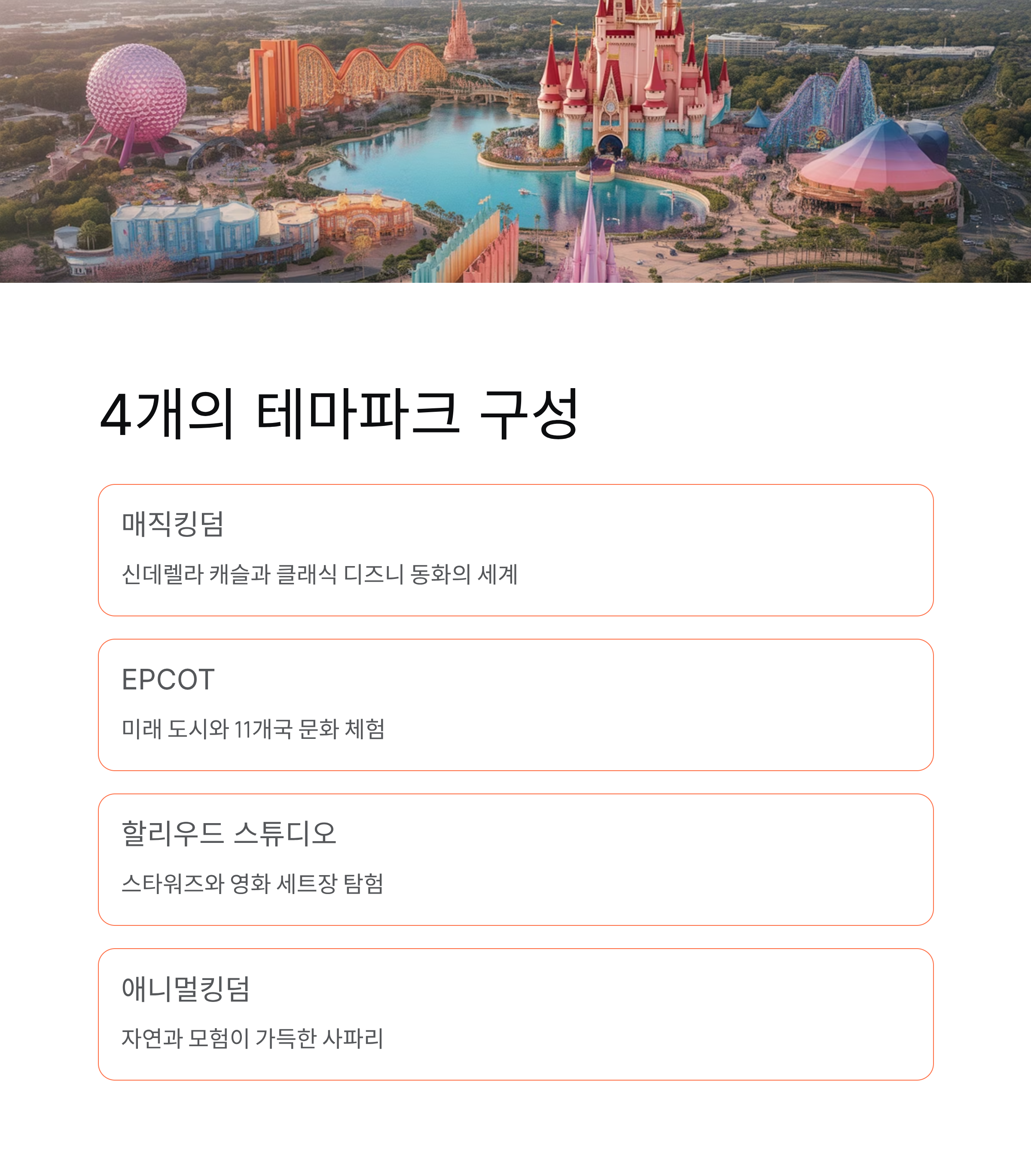 디즈니월드는 무려 4개의 주요 테마파크로 구성되어 있습니다. 각각의 개성이 완전히 다르기 때문에, 자신의 취향에 따라 우선순위를 정하는 것이 핵심이에요.