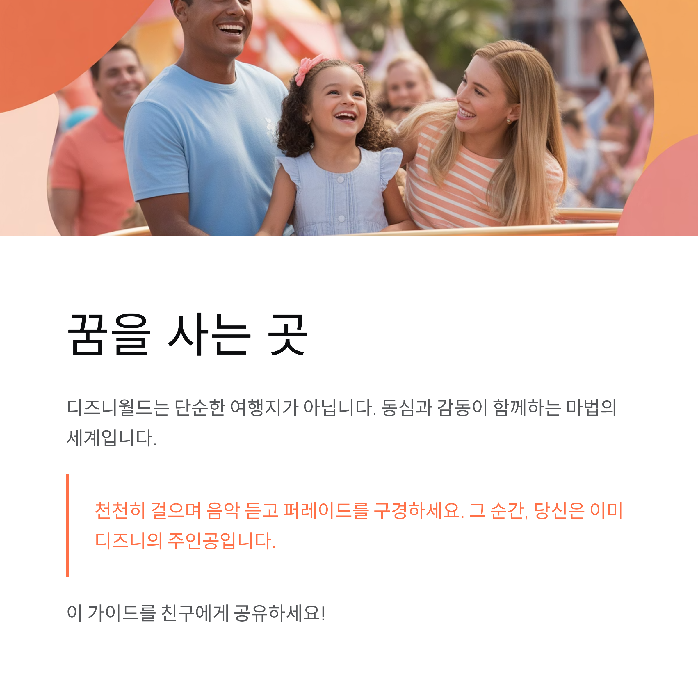미국 디즈니월드는 단순한 여행지가 아니라 ‘하루 동안 꿈을 사는 곳’이에요. 준비만 철저히 하면, 동심과 감동이 동시에 찾아옵니다.