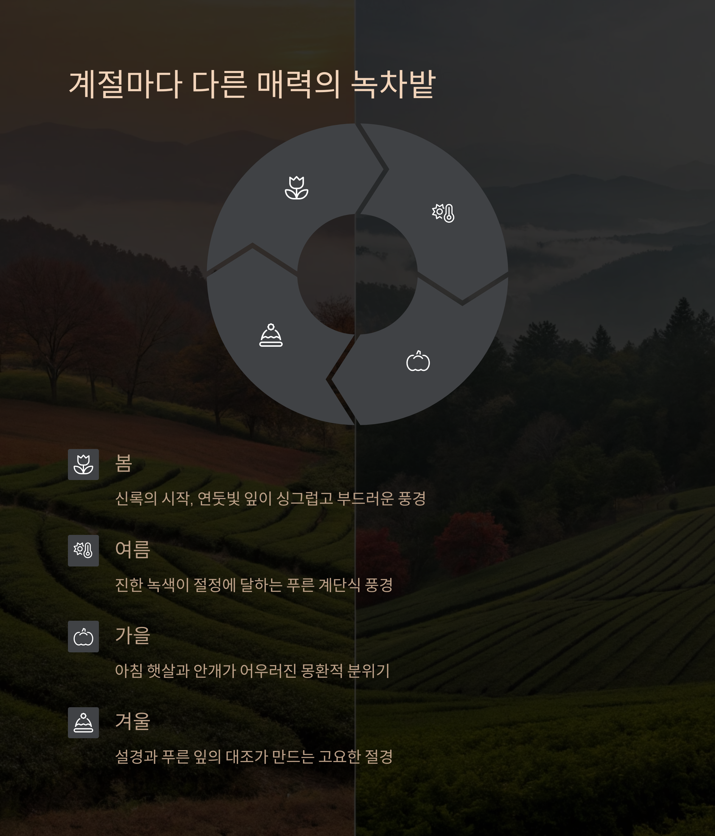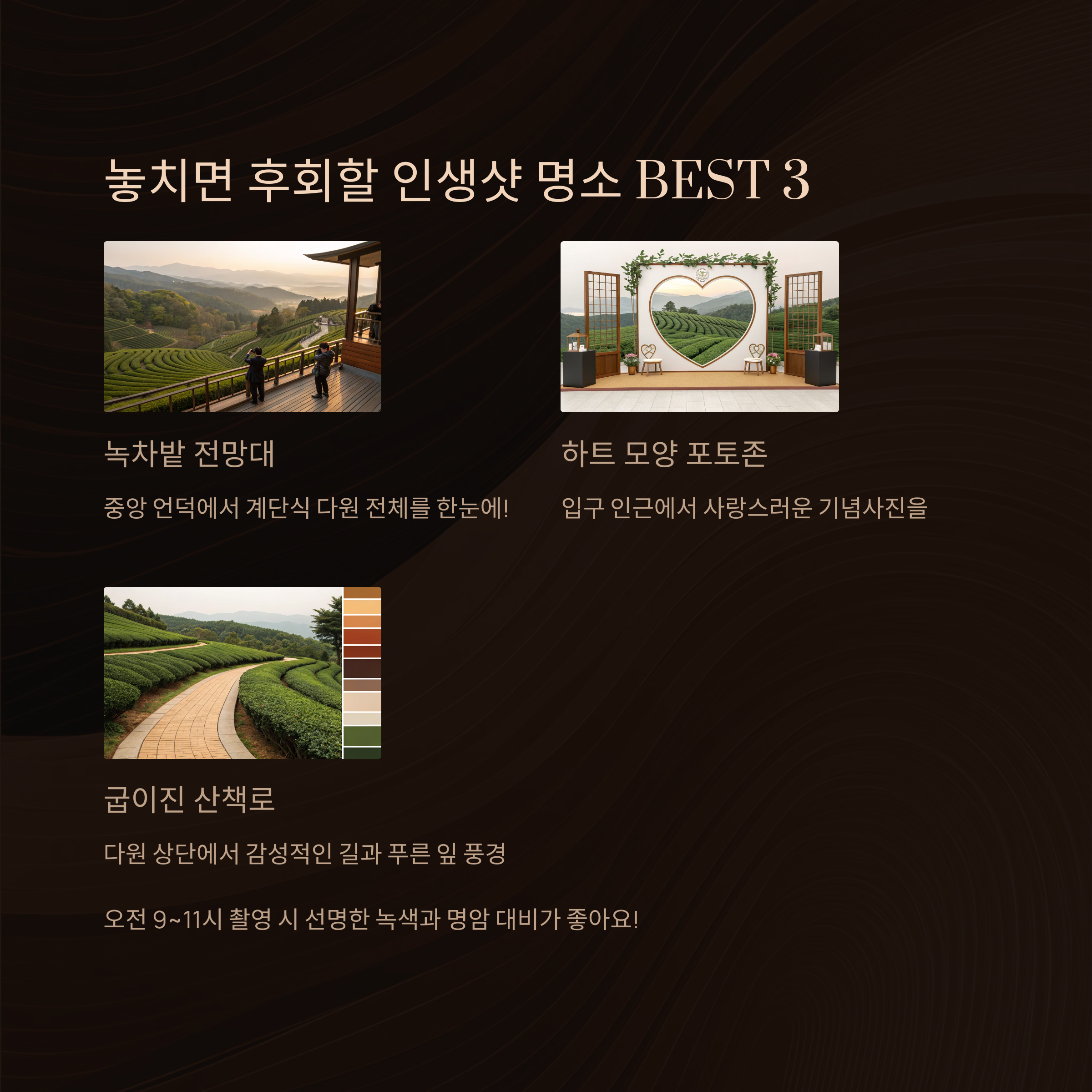| 녹차밭 전망대 | 중앙 언덕 | 다원 전체 조망 가능, 계단식 구조 강조 |