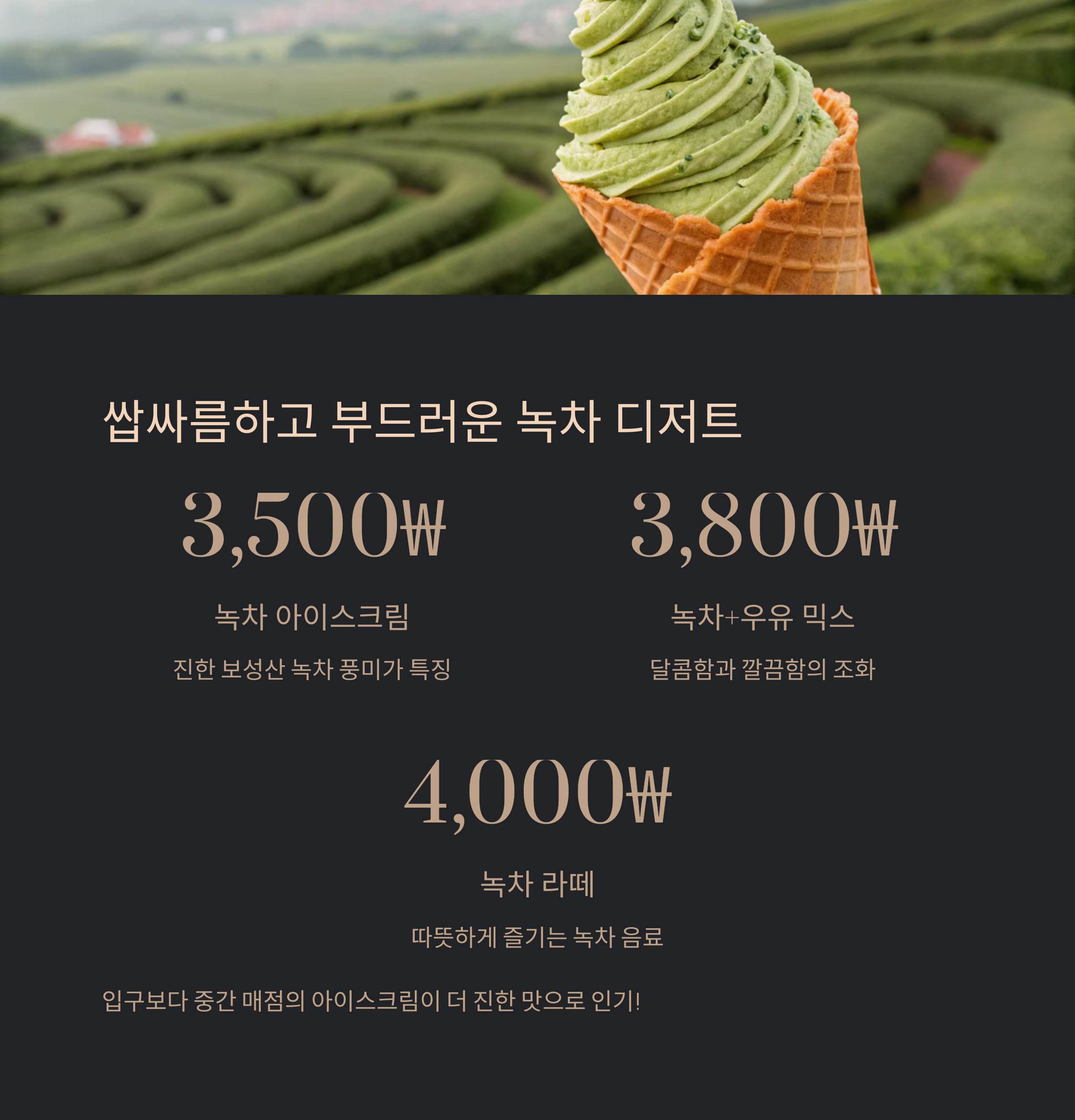 | 녹차 아이스크림 | 약 3,500원 | 풍미 진하고 녹차향 강함 |