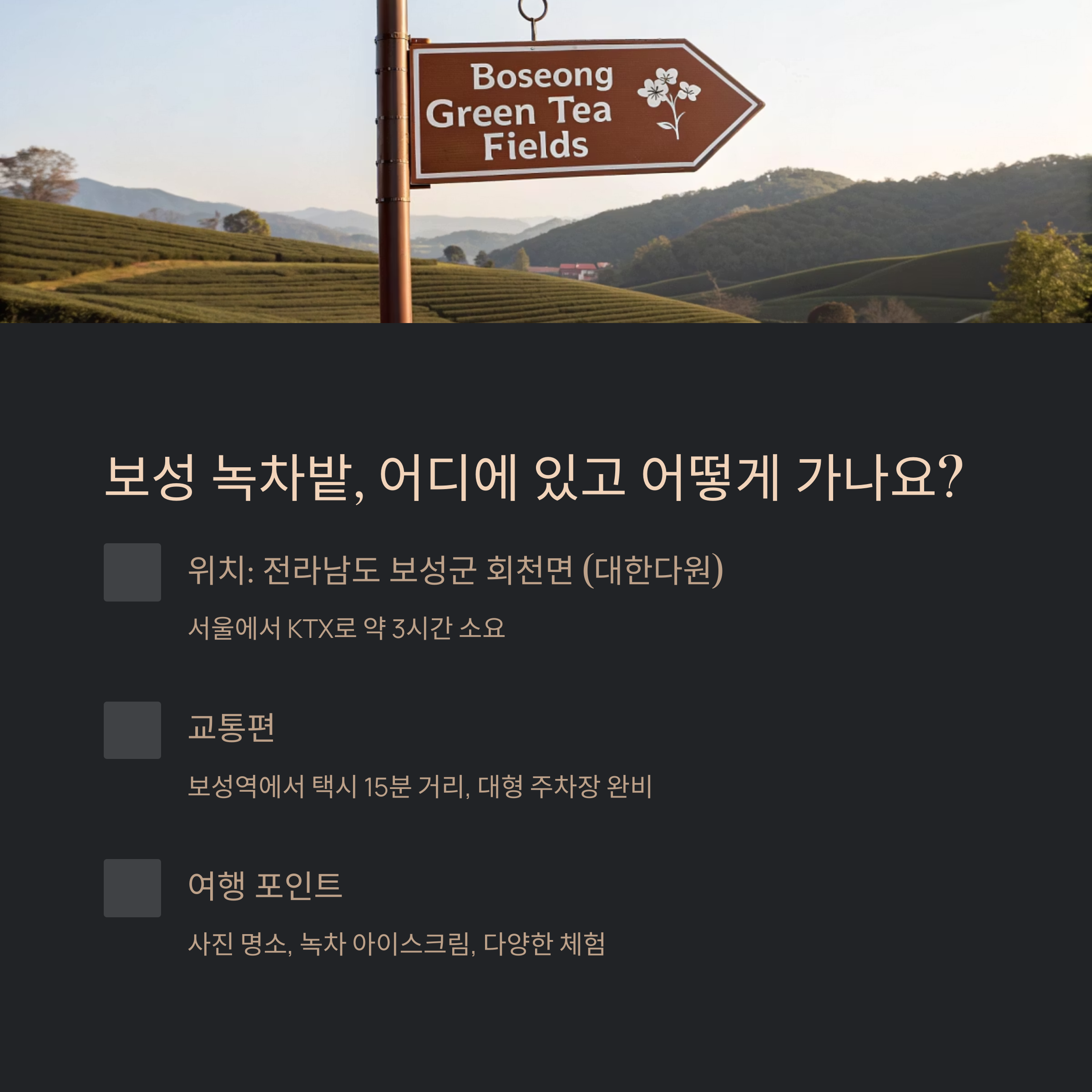 | 전남 보성군 회천면 | 보성역 → 택시 (15분) | 서울 → KTX 약 3시간 |
