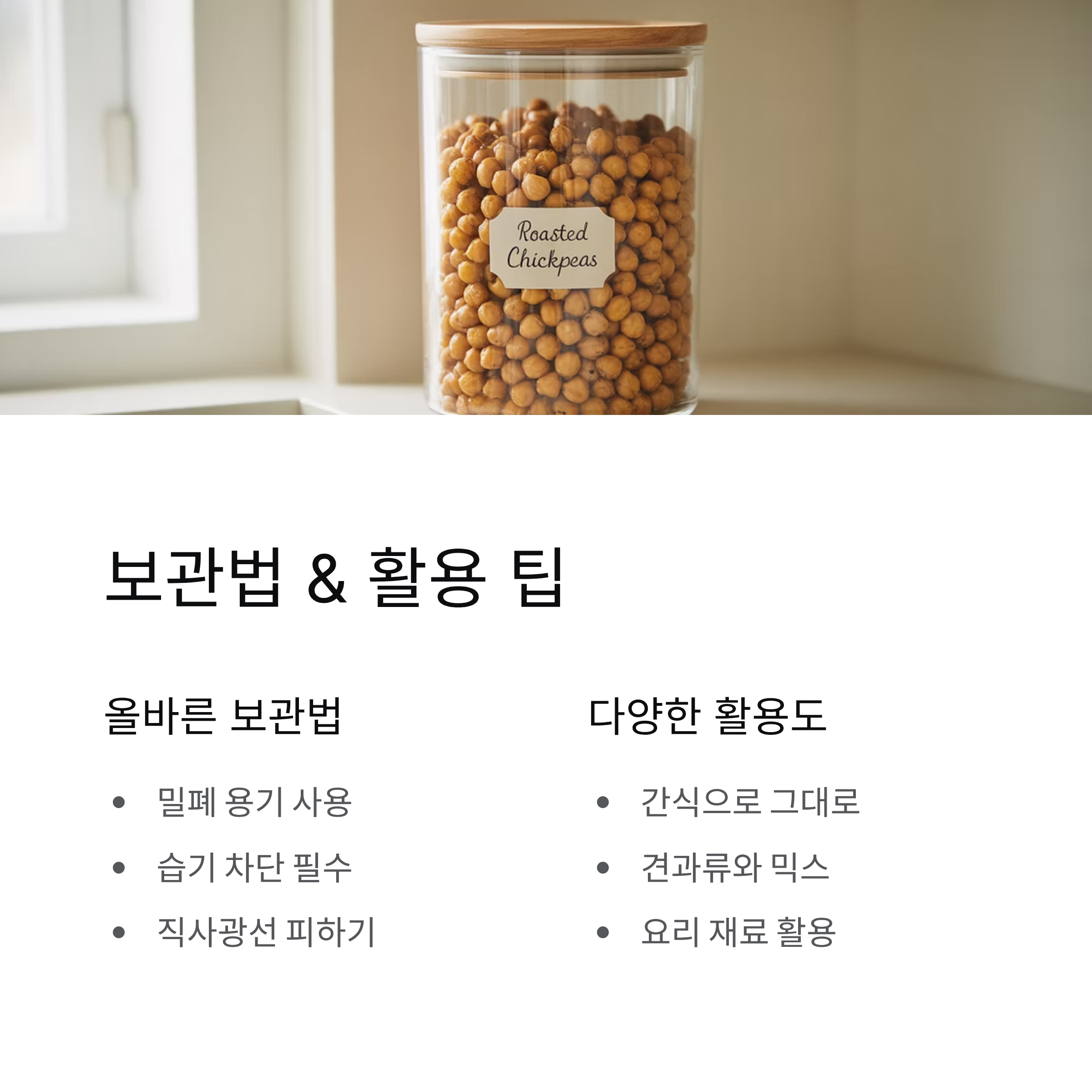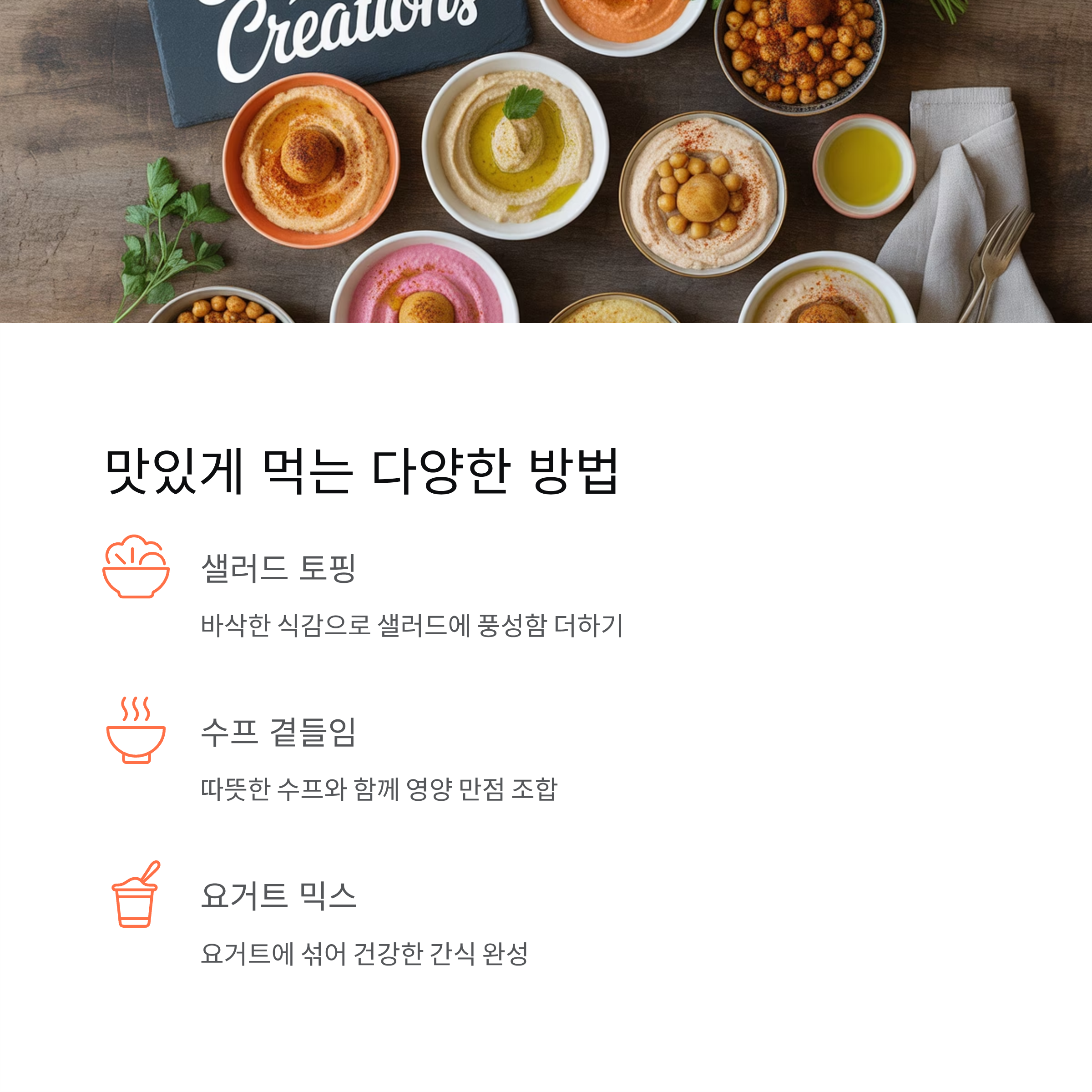 볶은 병아리콩은 그대로 즐겨도 좋지만, 샐러드 토핑으로 올리거나 수프, 요거트와 곁들이면 식감과 맛을 더 풍성하게 할 수 있습니다.
