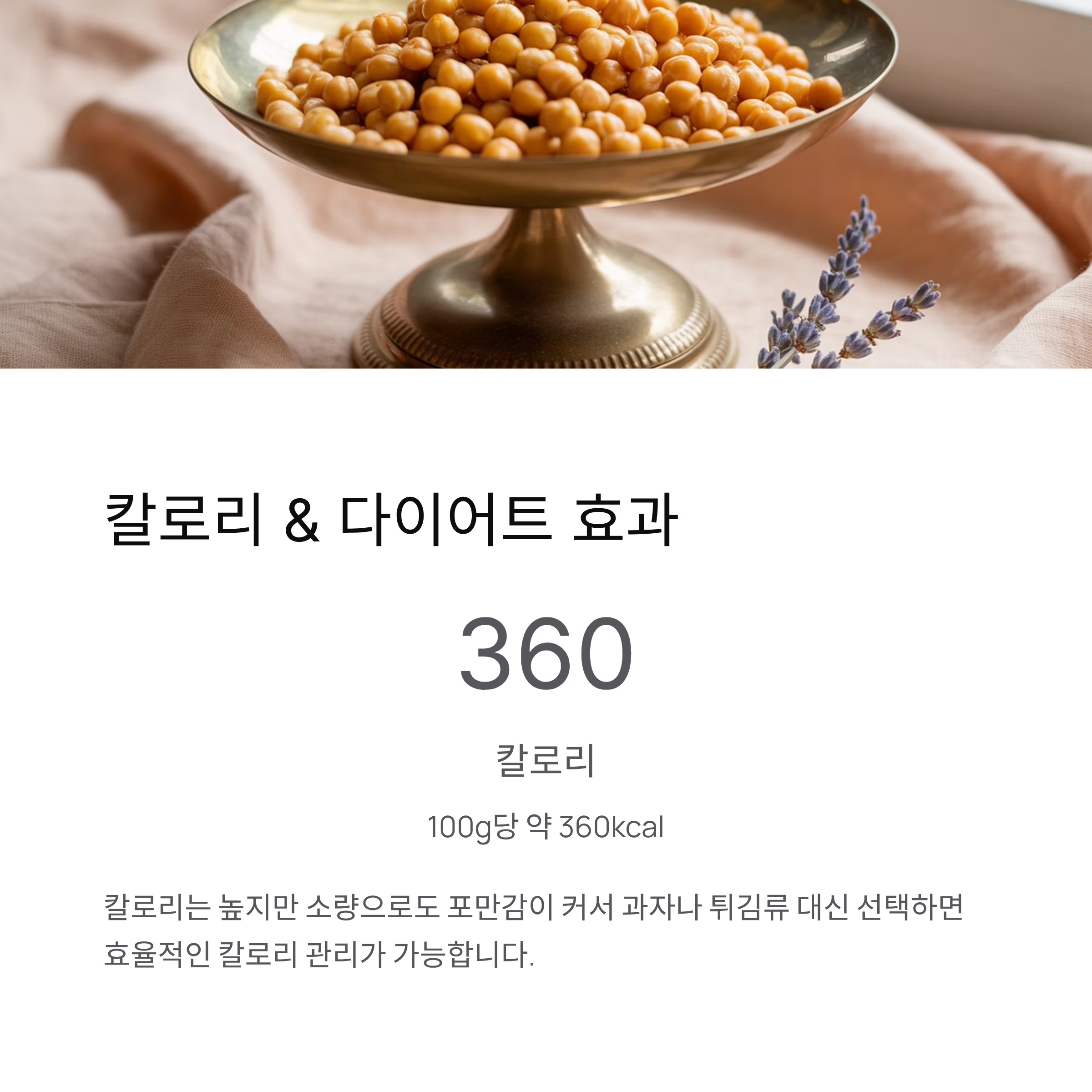 | 볶은 병아리콩 | 약 360kcal | 고소하고 바삭한 식감 | 간식, 샐러드 토핑, 요리 곁들임 |