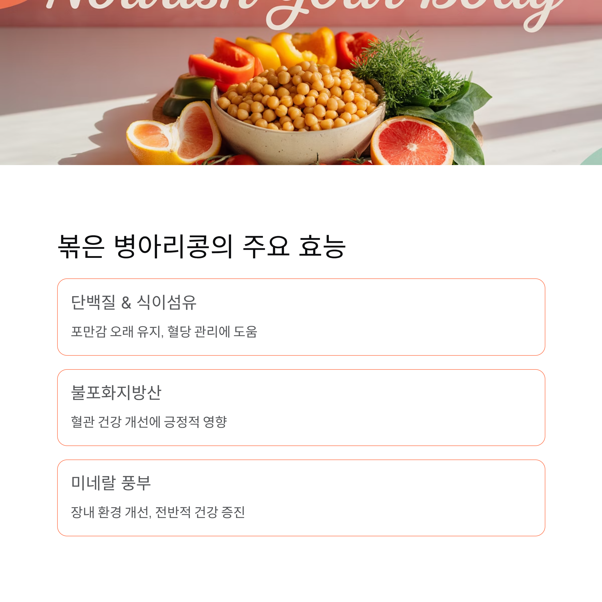볶은 병아리콩은 단백질과 식이섬유가 풍부해 포만감을 오래 유지시켜 주며, 혈당 관리에 긍정적인 영향을 줄 수 있습니다.
