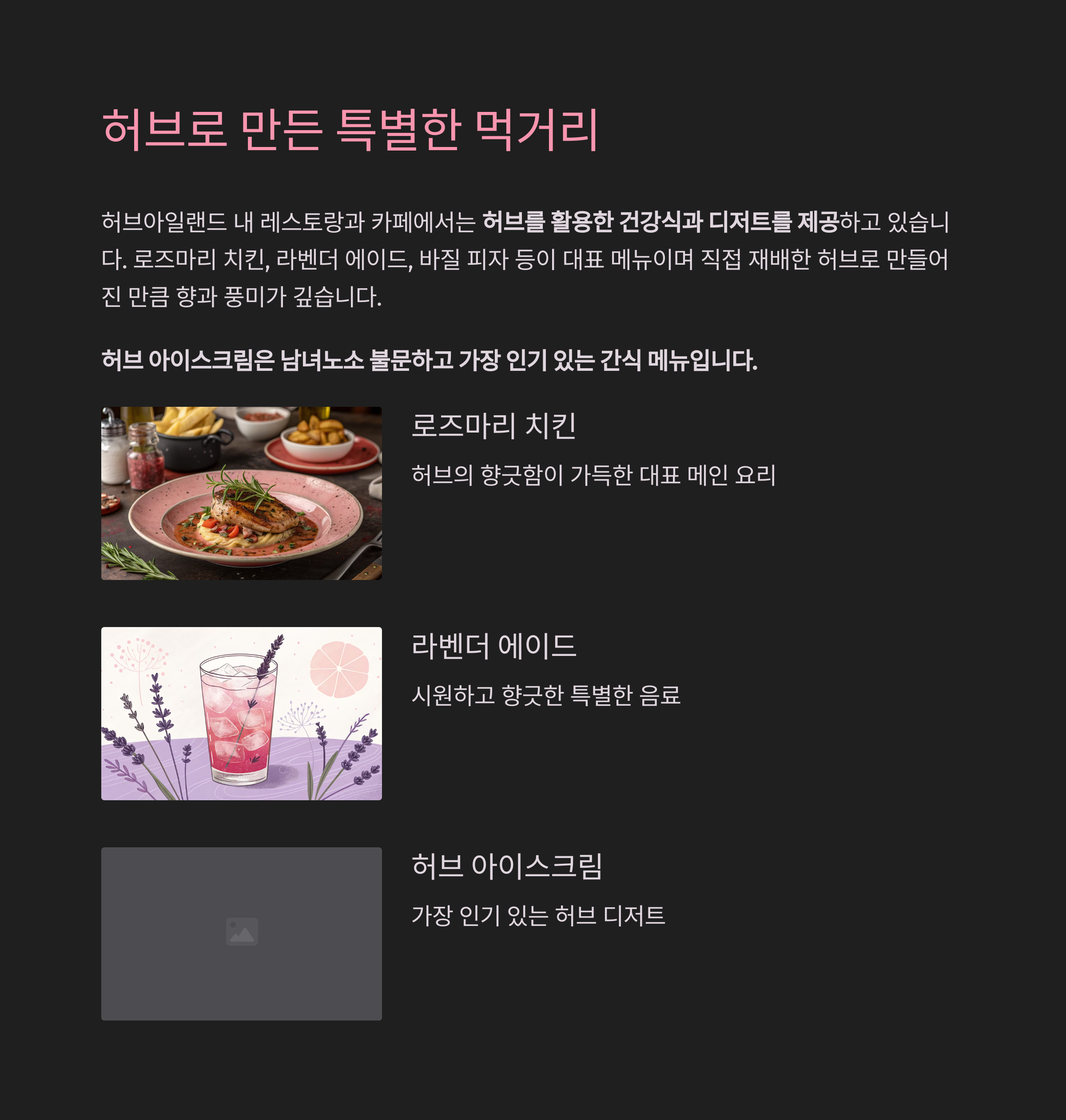 허브를 활용한 건강식과 디저트를 제공하고 있습니다.