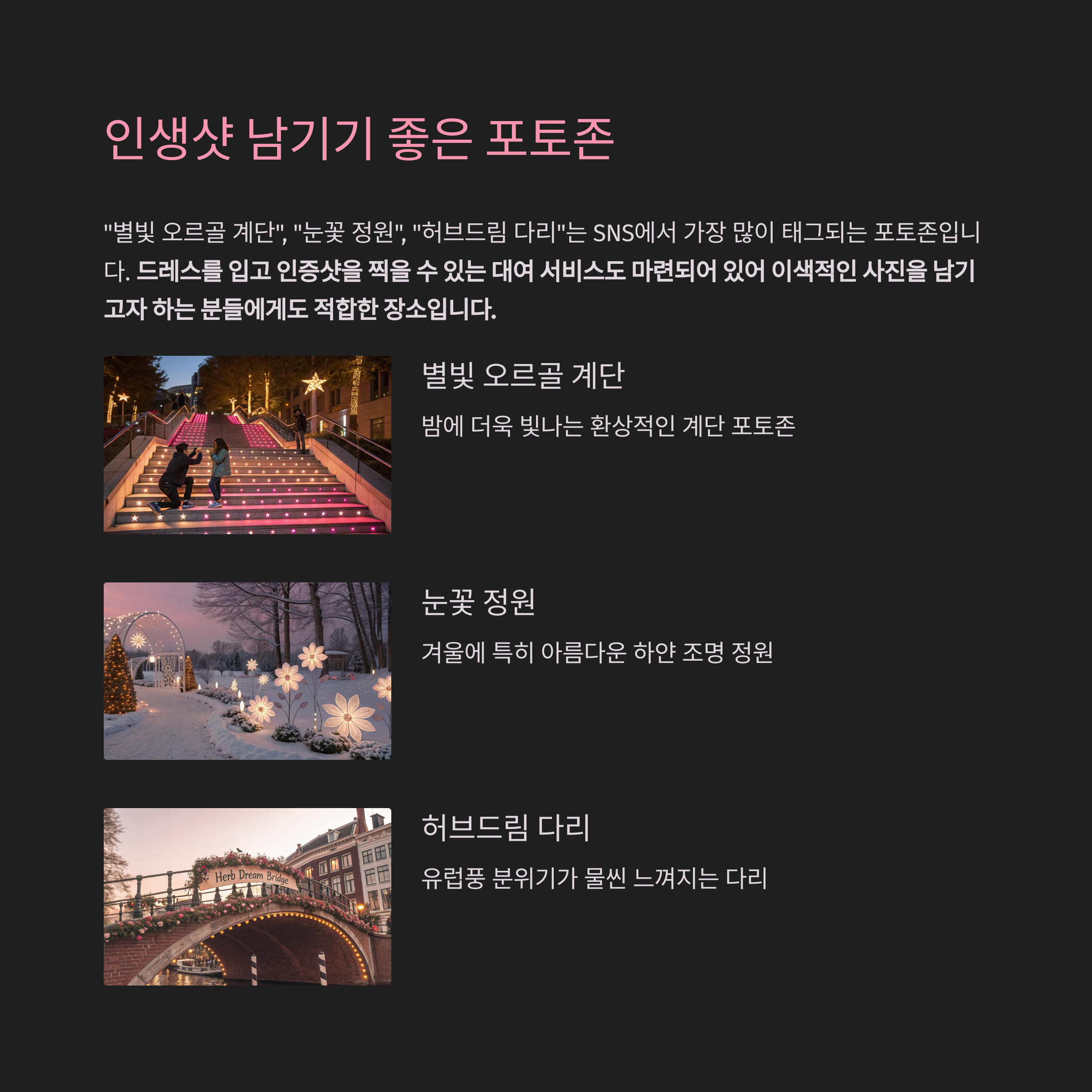 "별빛 오르골 계단", "눈꽃 정원", "허브드림 다리"는