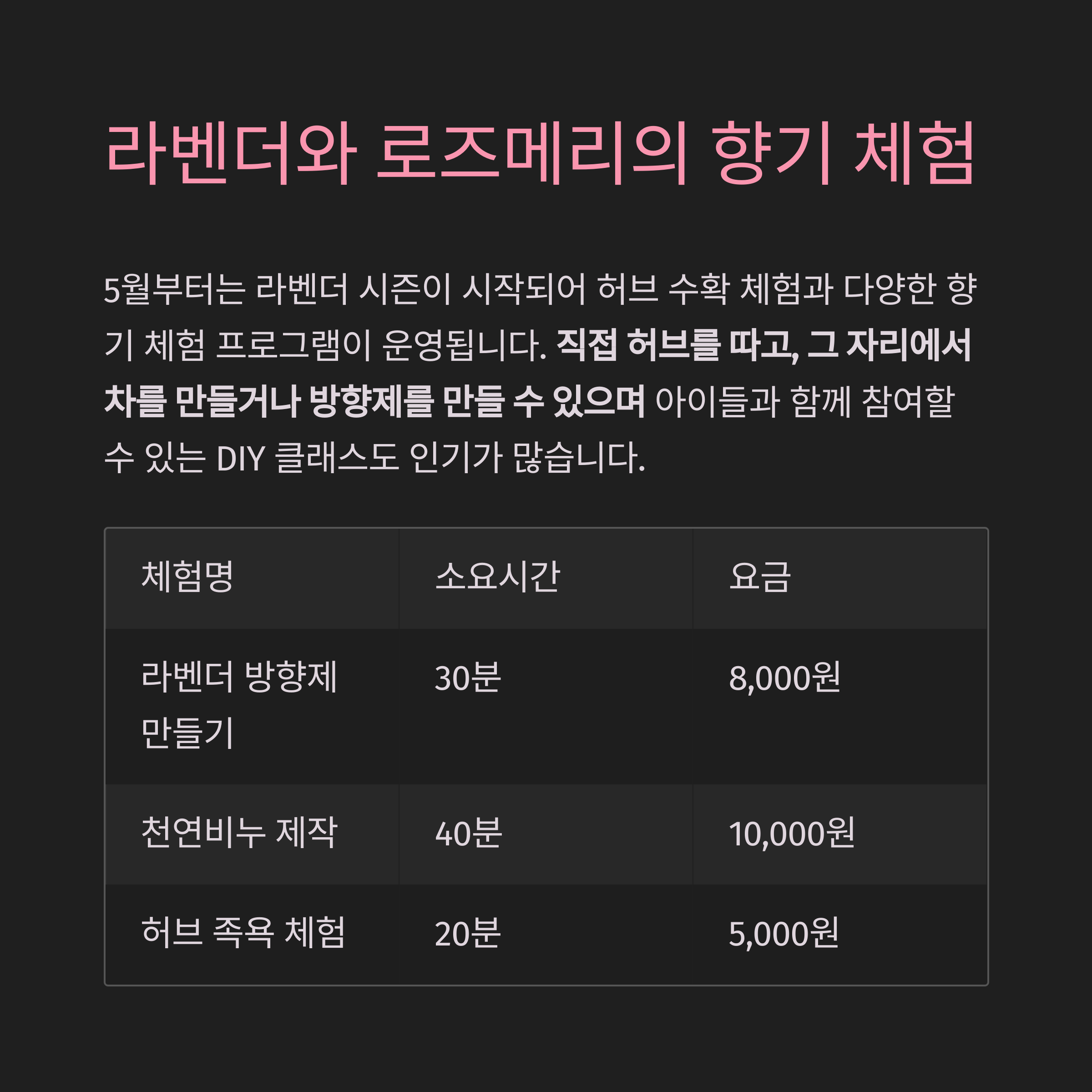 - 체험 프로그램: 라벤더 심기, 라벤더 차 수확, 라벤더 아이스크림 만들기 등투어랑+2onTrip+2감성팬트리+2
