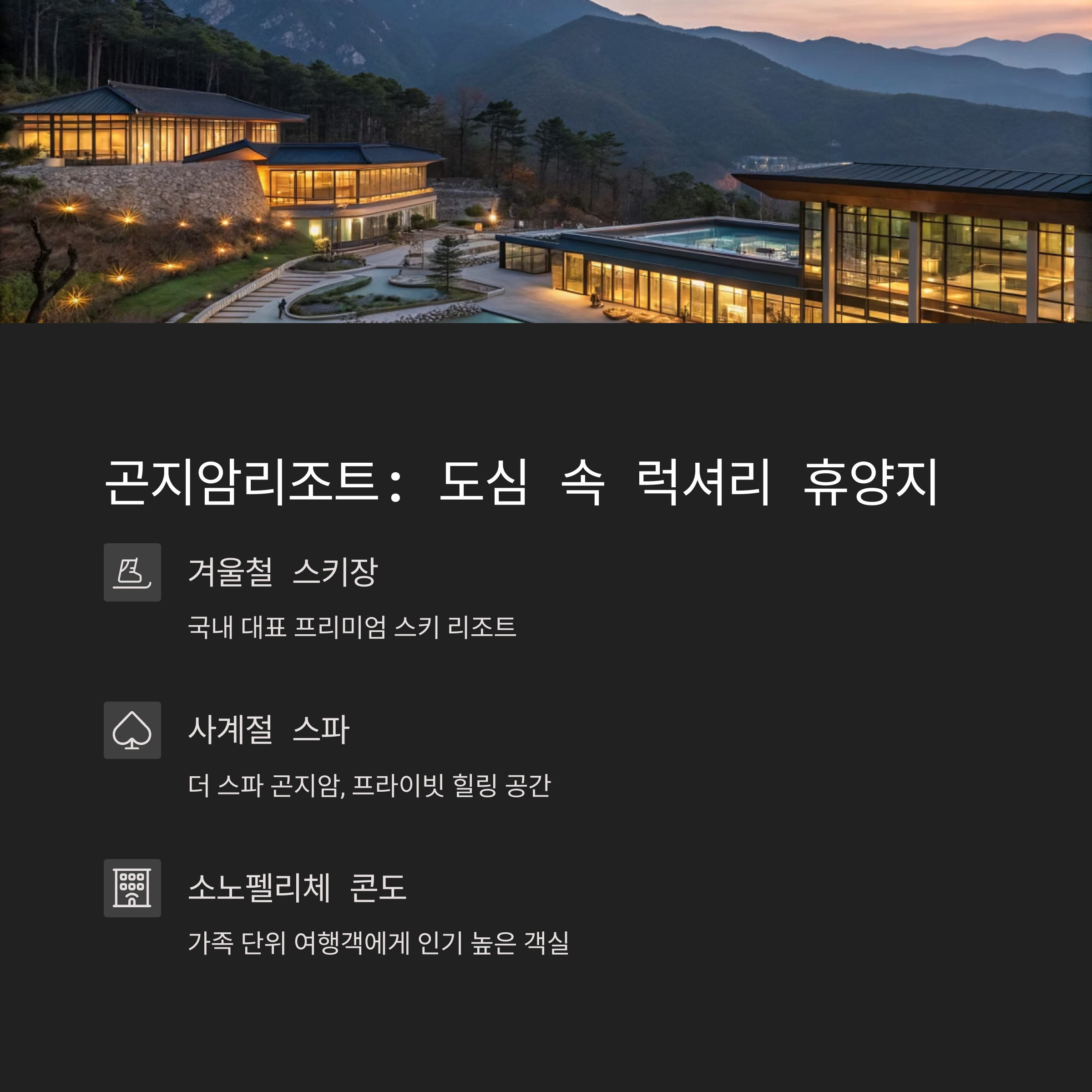 곤지암리조트는 럭셔리한 숙박과 스키장, 스파 시설로 유명하고,