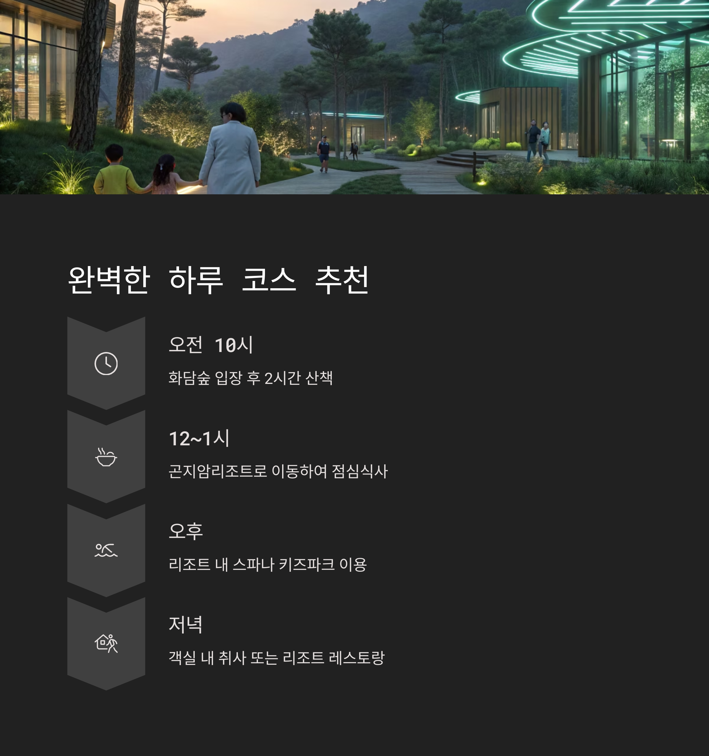오후에는 리조트 내 스파나 키즈파크 이용 후 체크인 →