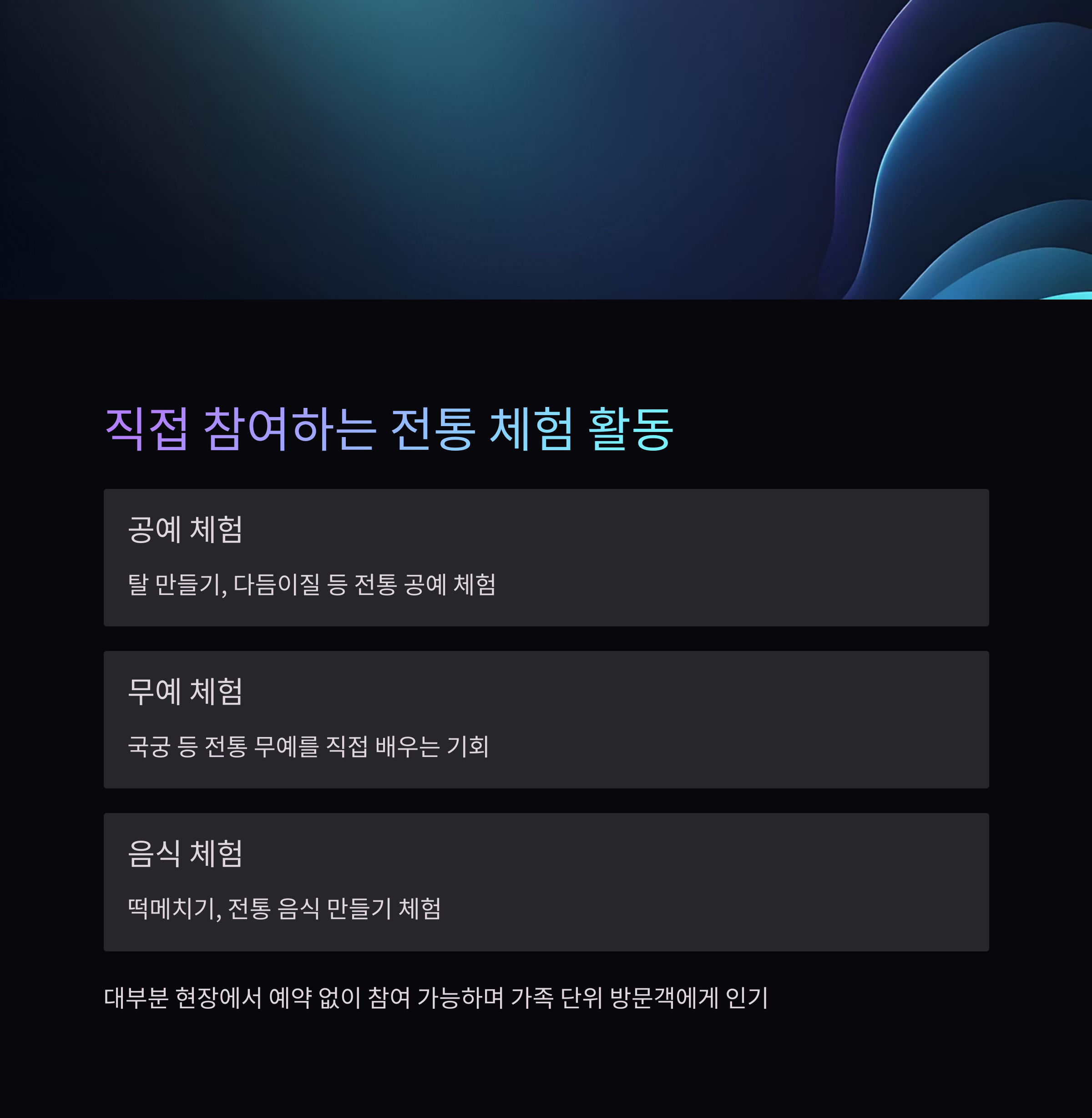 탈 만들기, 다듬이질, 국궁, 떡메치기, 사물놀이 체험 등을 실제로 해볼 수 있습니다.