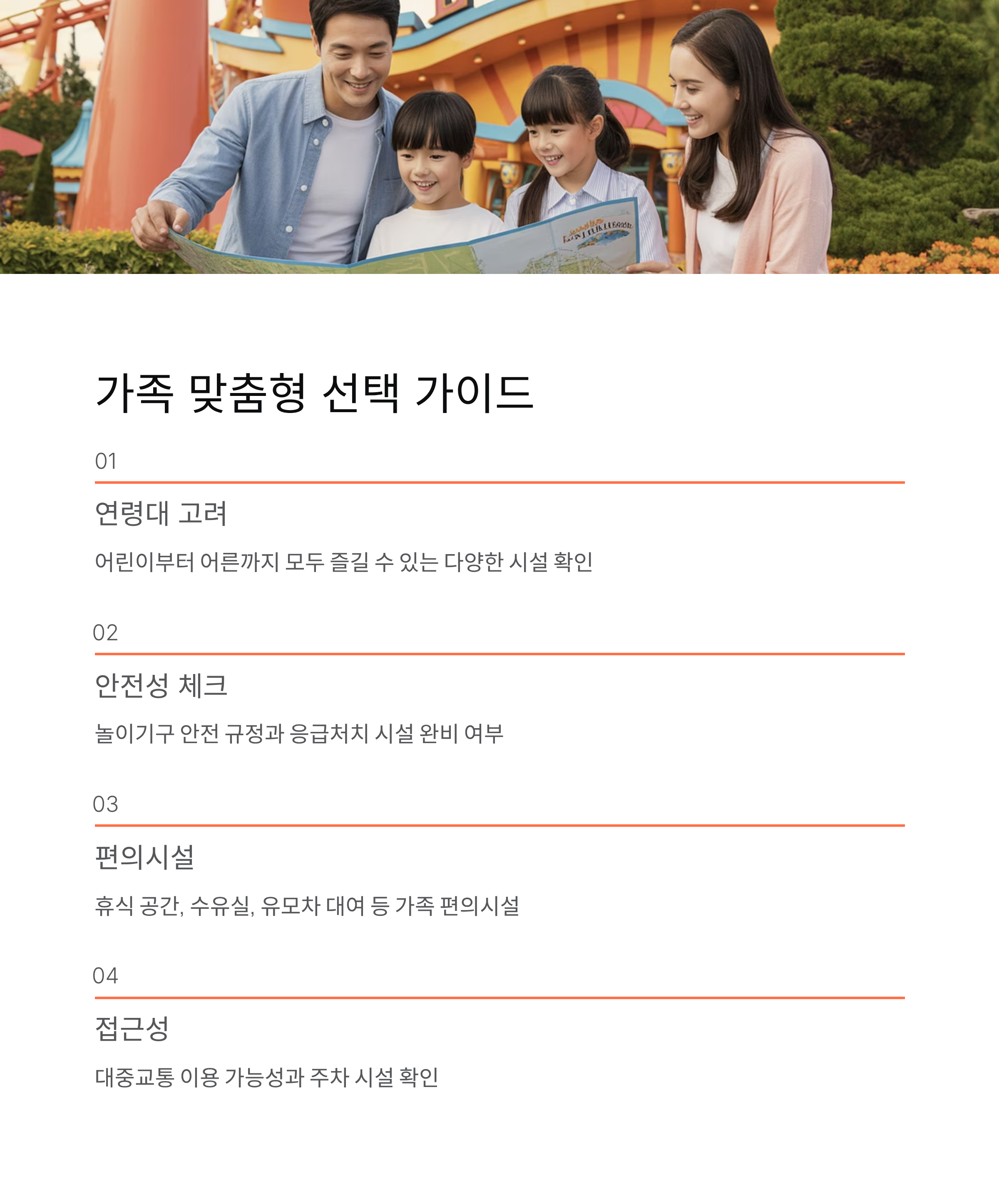 연령대가 다른 가족 구성원이 모두 즐길 수 있는 놀이공원을 고르는 것이 중요합니다.