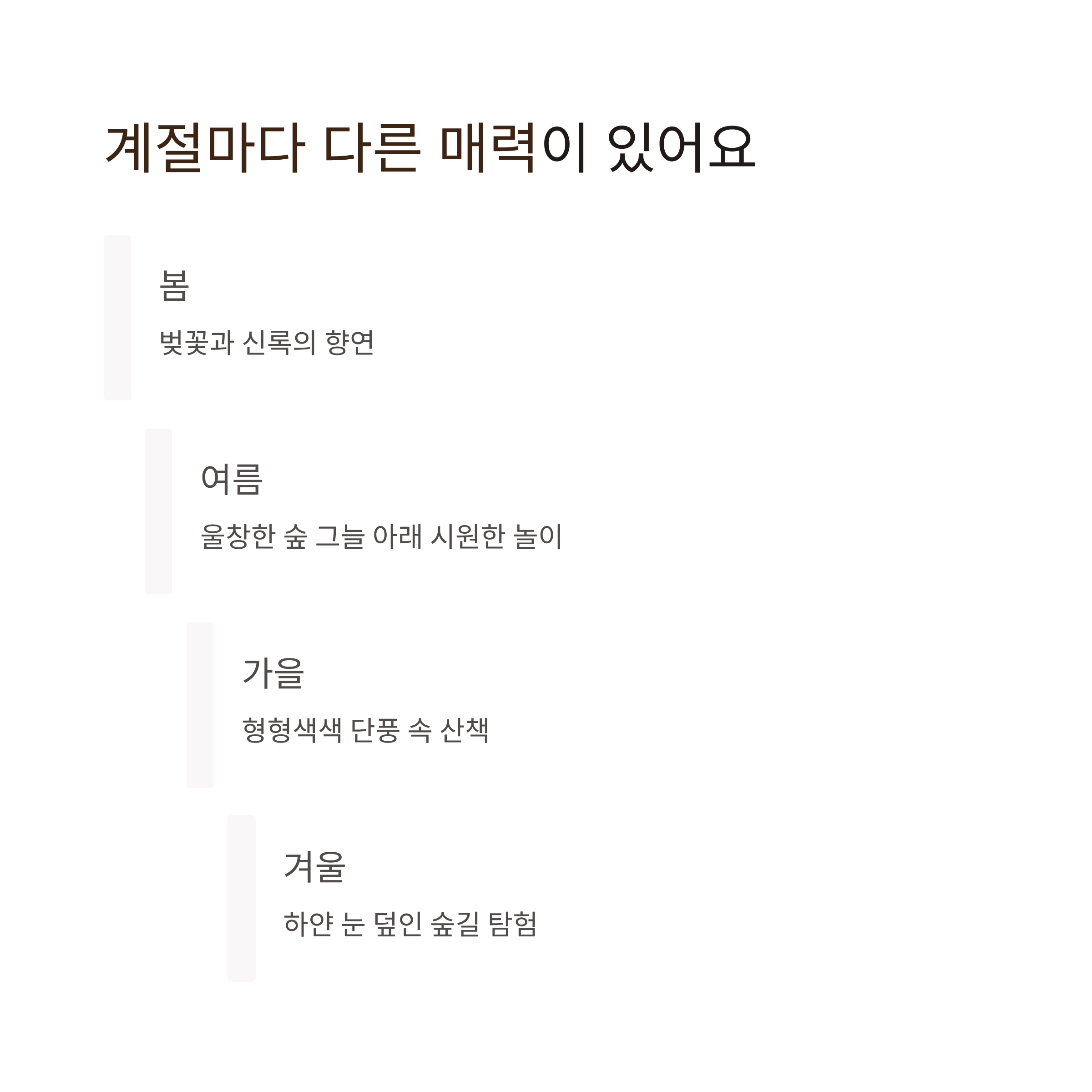 학습원 외부에는 숲길 산책로와 작은 연못이 마련되어 있어 사계절의 자연을 느낄 수 있습니다. 봄에는 다양한 꽃과 새, 여름에는 곤충과 푸른 숲, 가을에는 단풍과 열매, 겨울에는 생태계의 휴면 과정을 직접 체험할 수 있습니다.