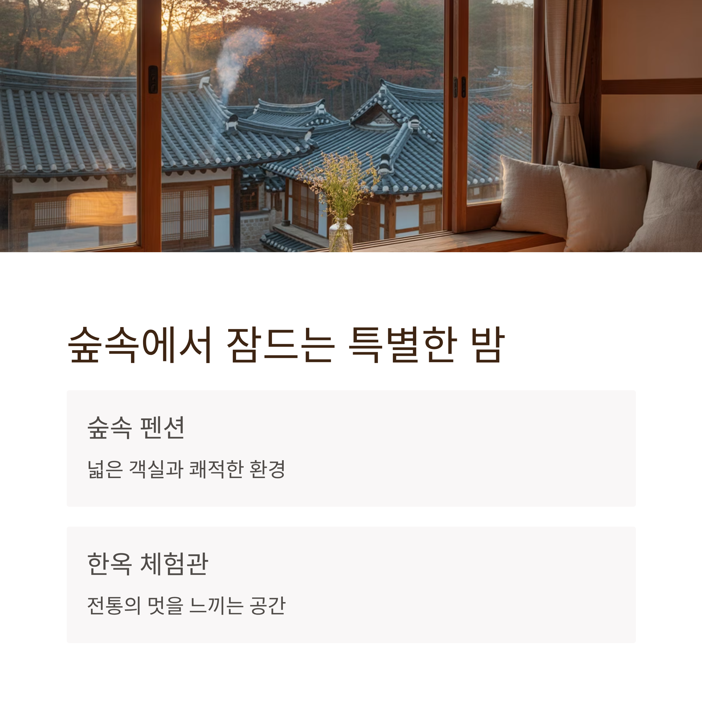 마을 내에는 숲속 펜션형 숙소와 한옥 체험관이 준비되어 있어 취향에 따라 선택할 수 있습니다.