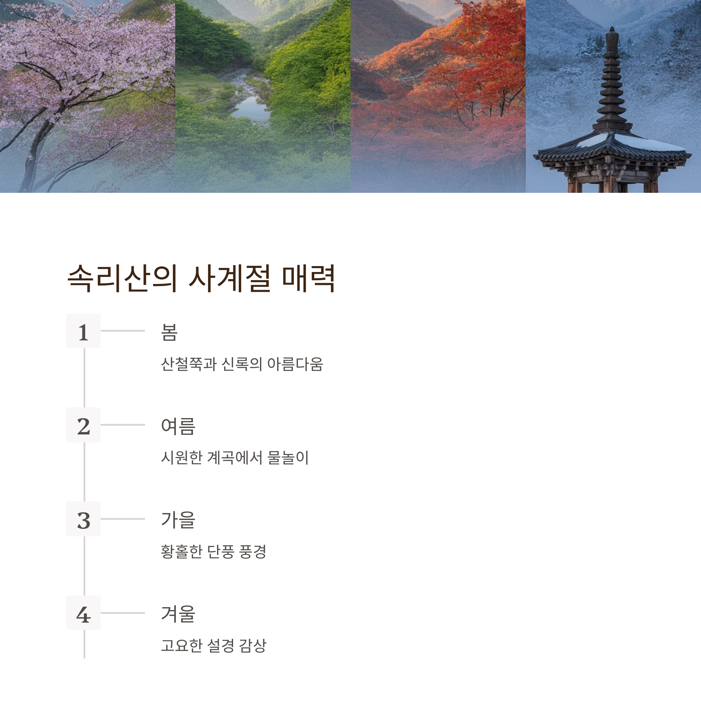 계절에 따라 단풍놀이, 여름 물놀이, 겨울 설경 감상까지 즐길 수 있어 사계절 여행지로 손색이 없습니다.