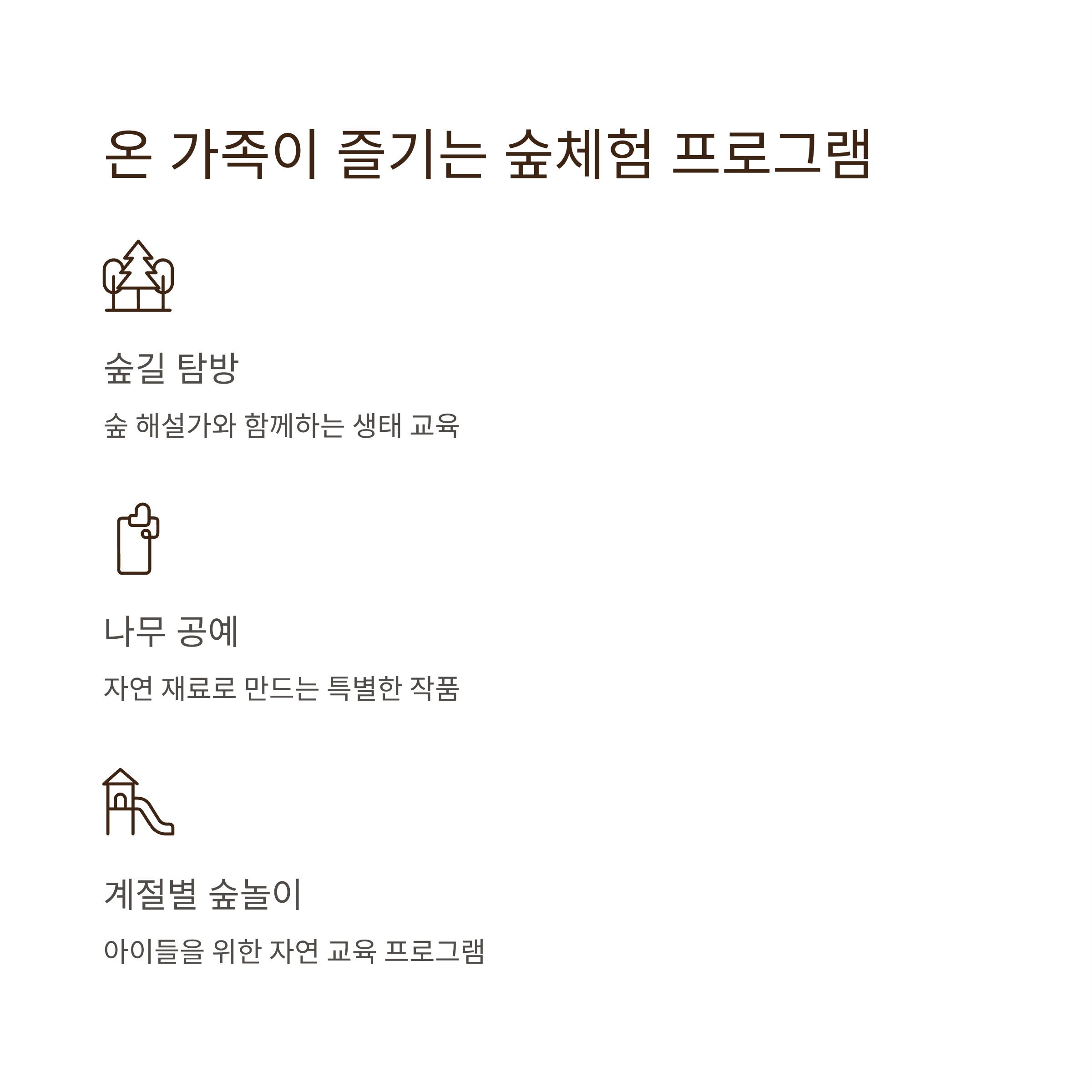 숲 해설가와 함께하는 숲길 탐방, 나무 공예 체험, 계절별 숲놀이 등 아이들과 어른 모두 즐길 수 있는 다양한 프로그램이 마련되어 있습니다.