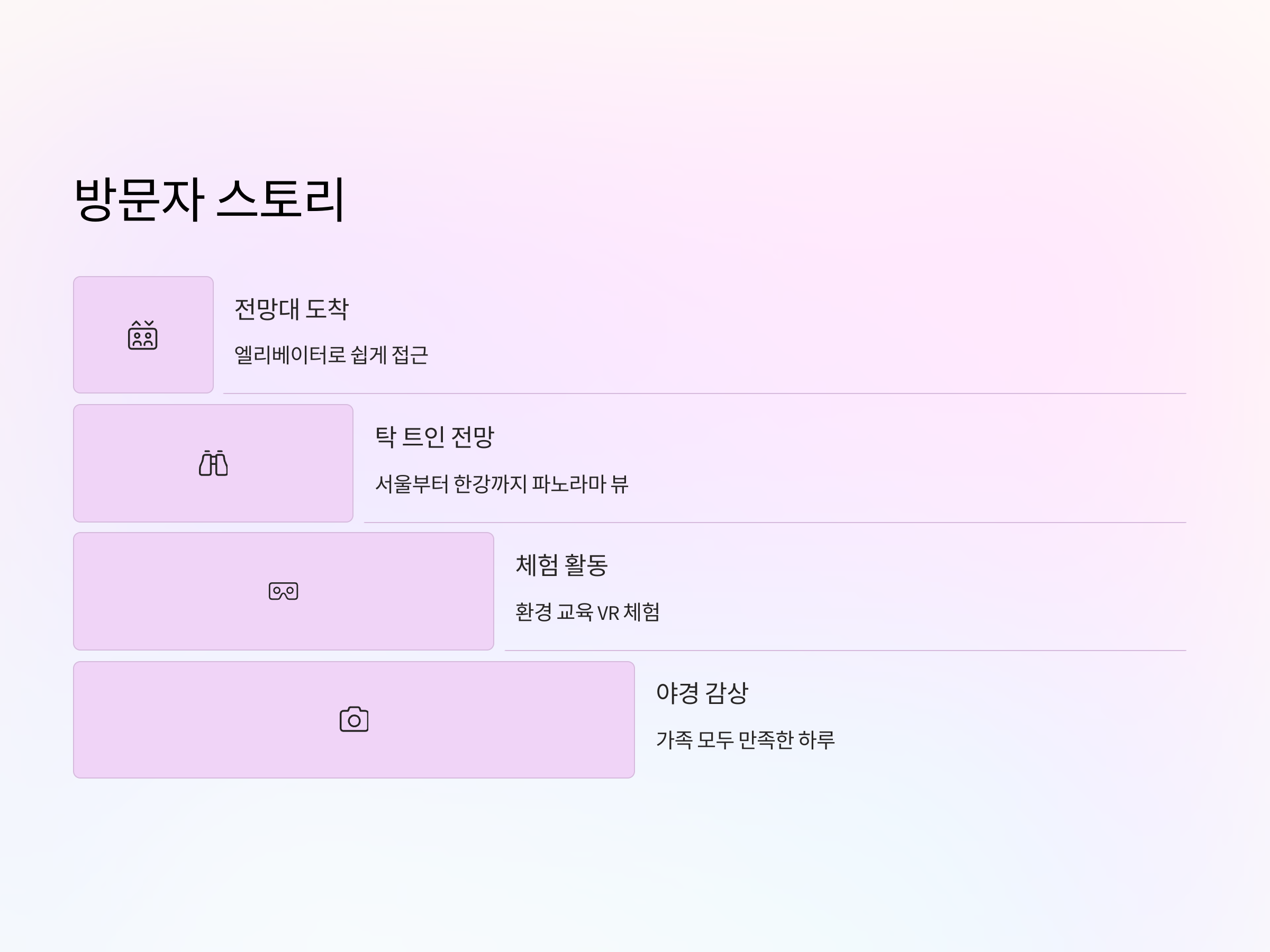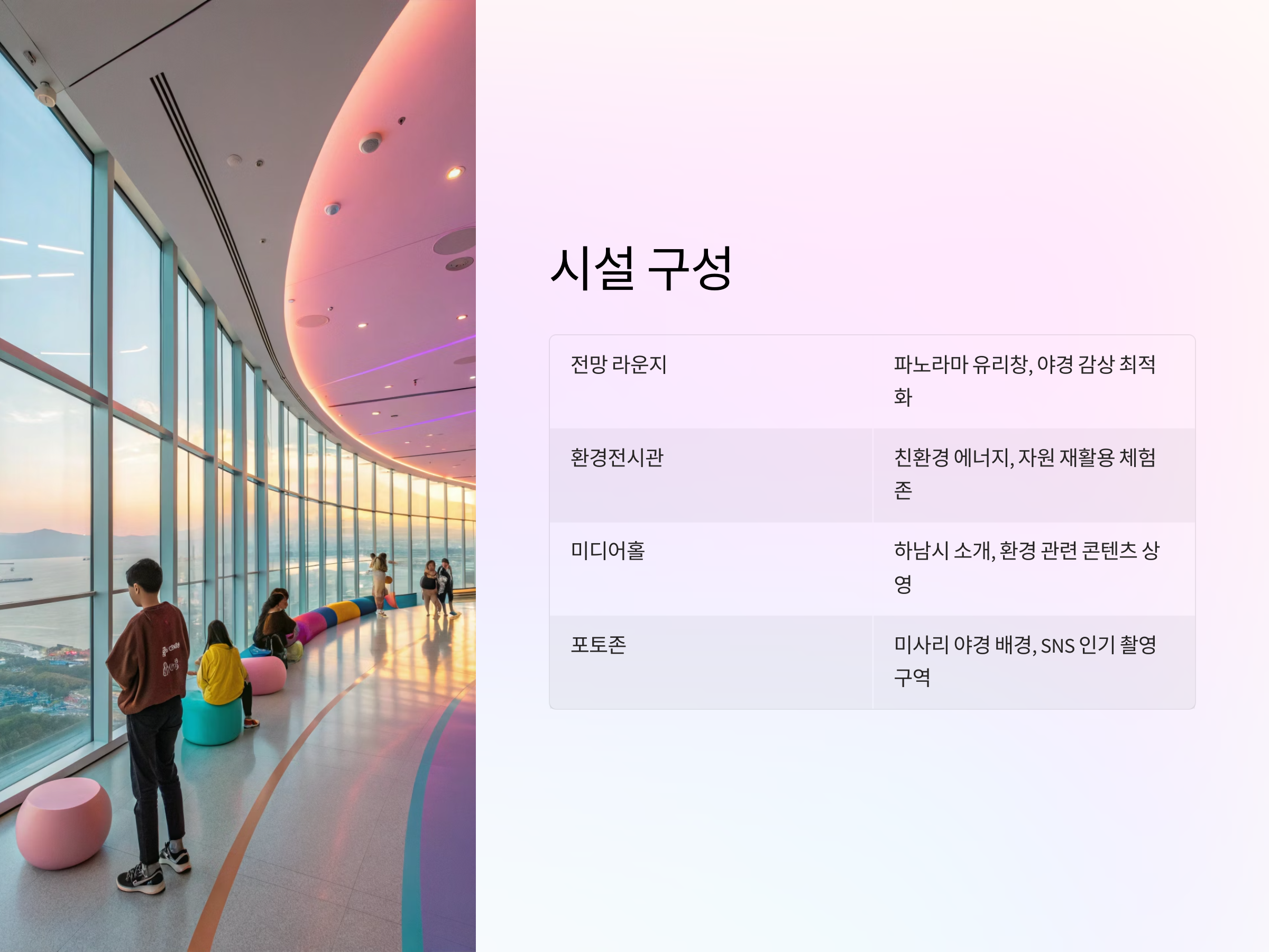 | 전망 라운지 | 파노라마 유리창 설치, 야경 감상 최적화 |