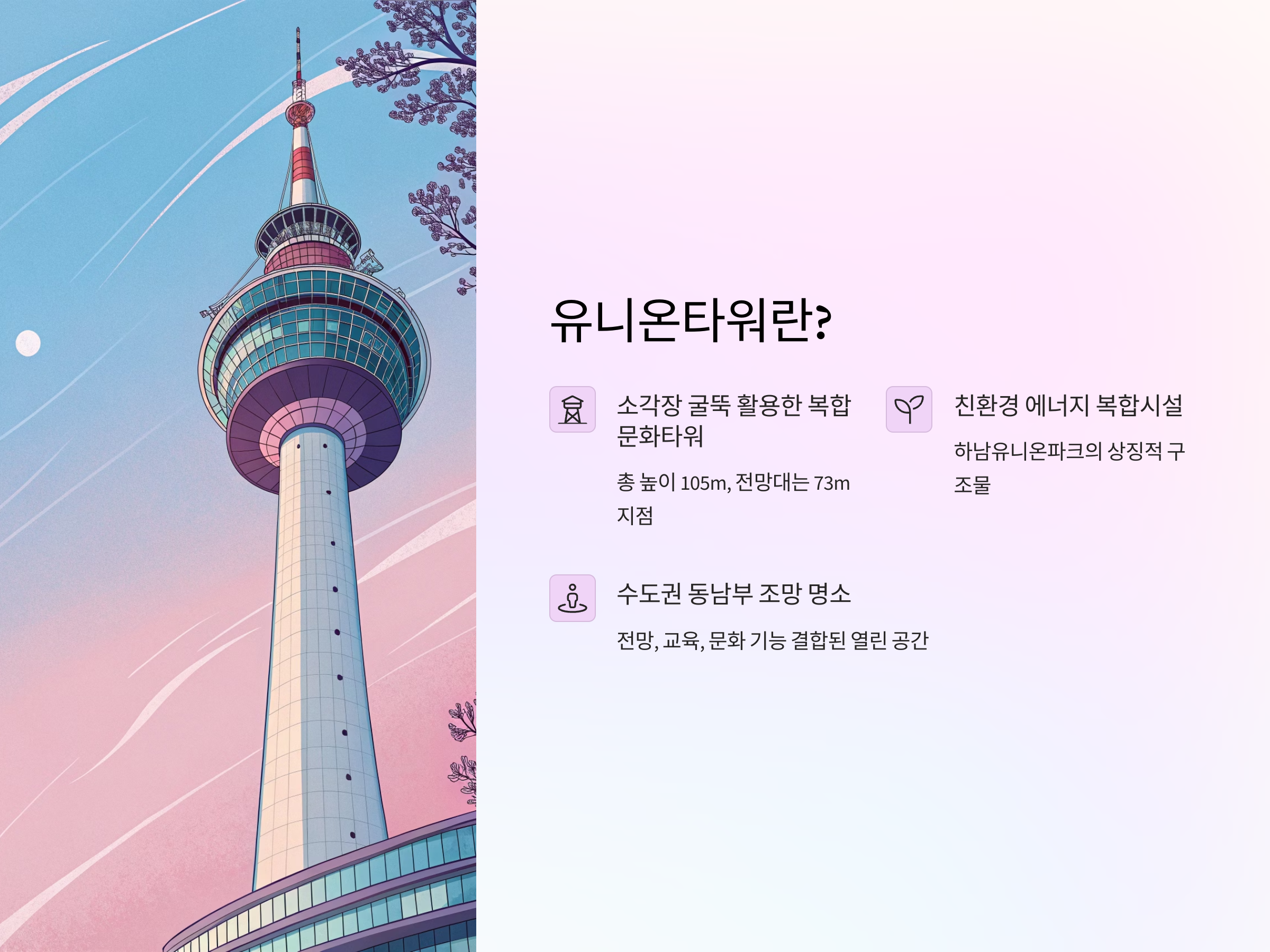 경기도 하남시에 위치한 유니온타워 전망대는 수도권 동남부를 한눈에 조망할 수 있는 고지대 전망 명소로, 친환경 에너지 복합시설 ‘하남유니온파크’의 상징적인 구조물입니다.