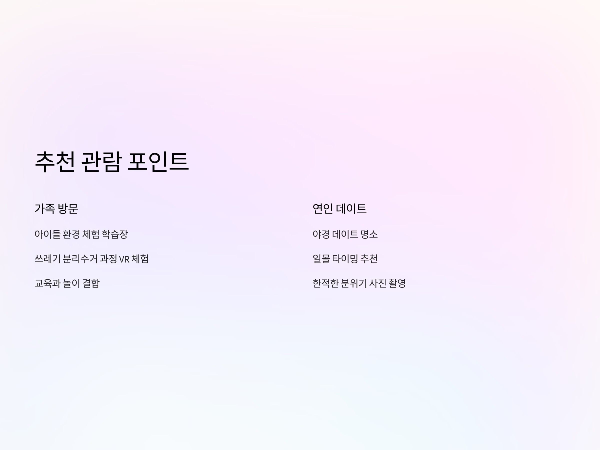 전시관에서 쓰레기 분리수거 과정을 VR로 체험하고, 야경 찍으며 하루를 마무리하니, 가족 모두 만족한 하루였어요.”