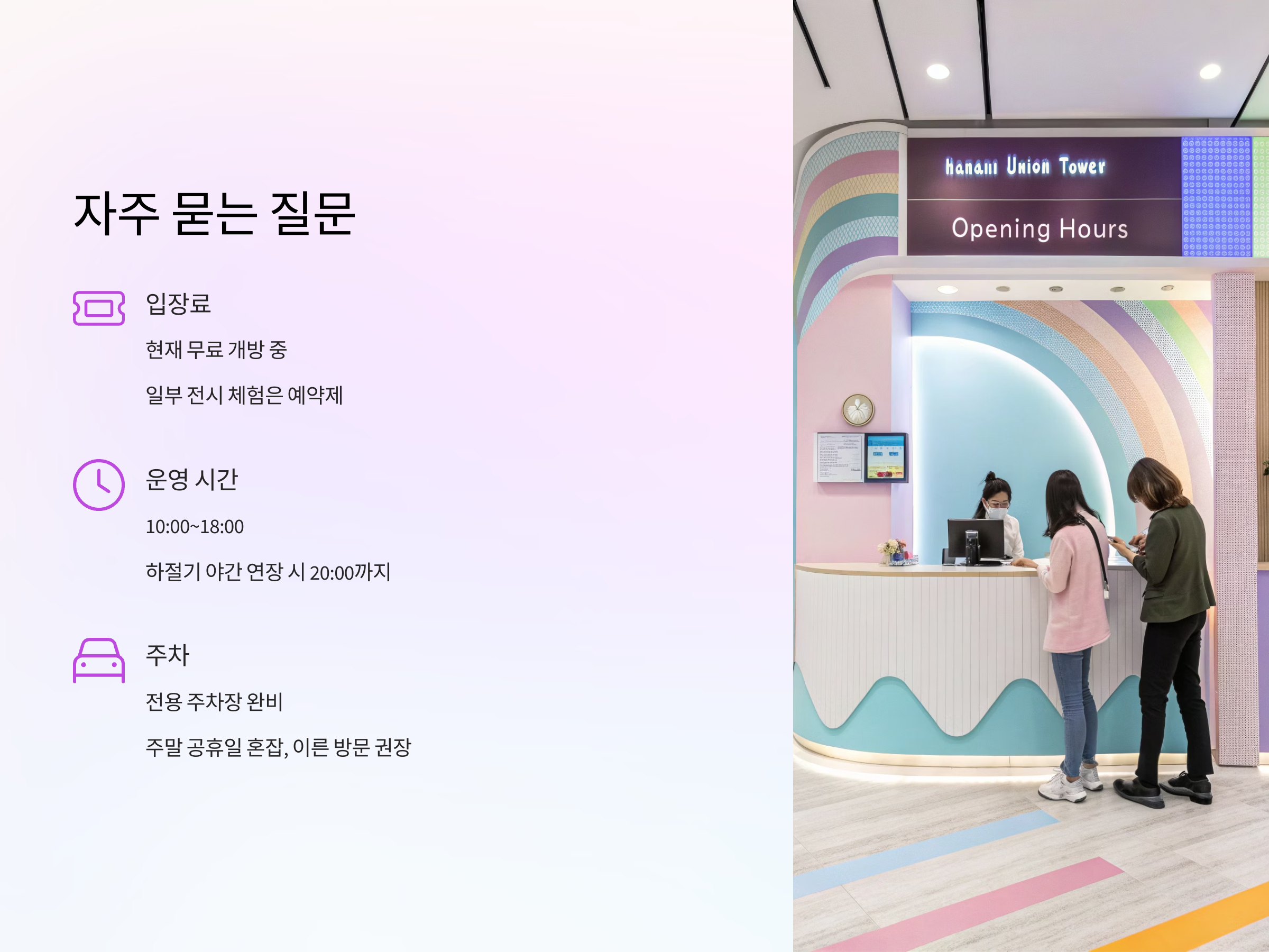 A: 현재 무료로 개방 중이며, 일부 전시 체험은 예약제입니다