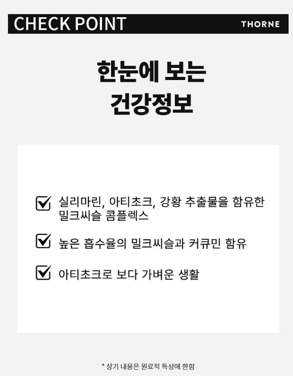 쏜리서치는 해외에서도 꽤 유명한 영양제 브랜드로 알려져 있는데요. S.A.T 캡슐은 이름처럼 Silymarin(밀크시슬), Artichoke(아티초크), Turmeric(강황) 같은 성분을 중심으로 간 건강을 돕도록 설계된 제품입니다.