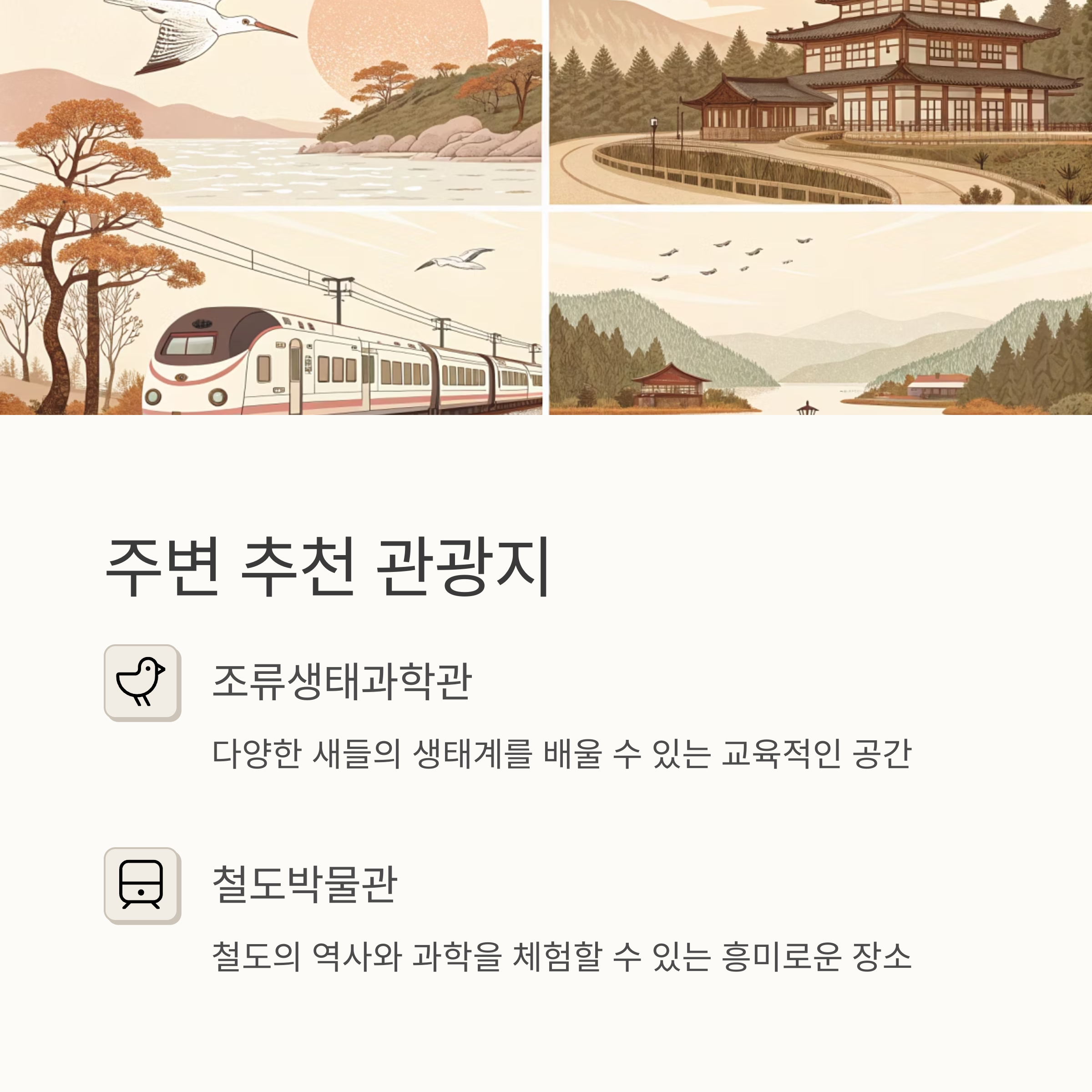 - 주변 관광지: 조류생태과학관, 철도박물관 등과 연계하여 방문하면 더욱 풍성한 나들이가 가능합니다.(uwrailpark.co.kr, info.mangos-rich.com)