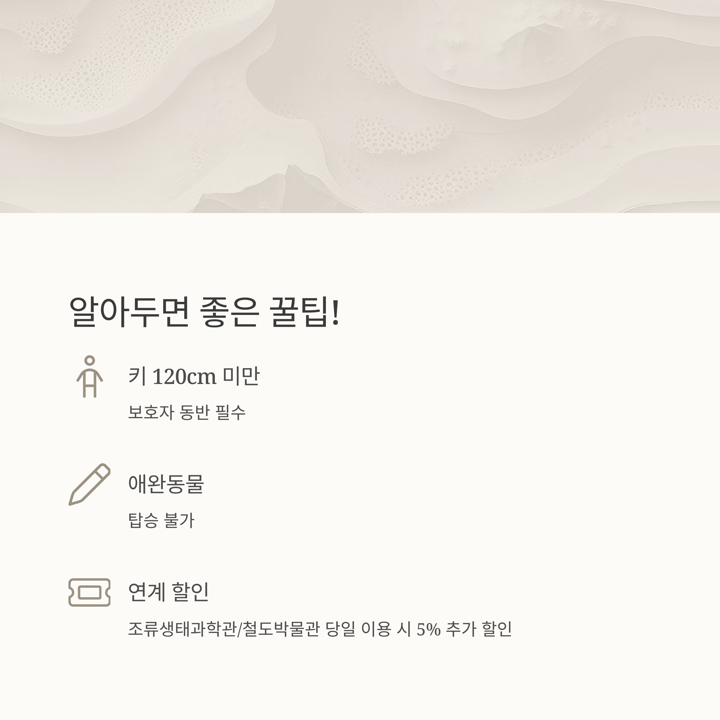 - 탑승 제한: 신장 120cm 미만의 어린이는 보호자와 함께 동승해야 하며, 애완동물은 탑승이 제한됩니다.