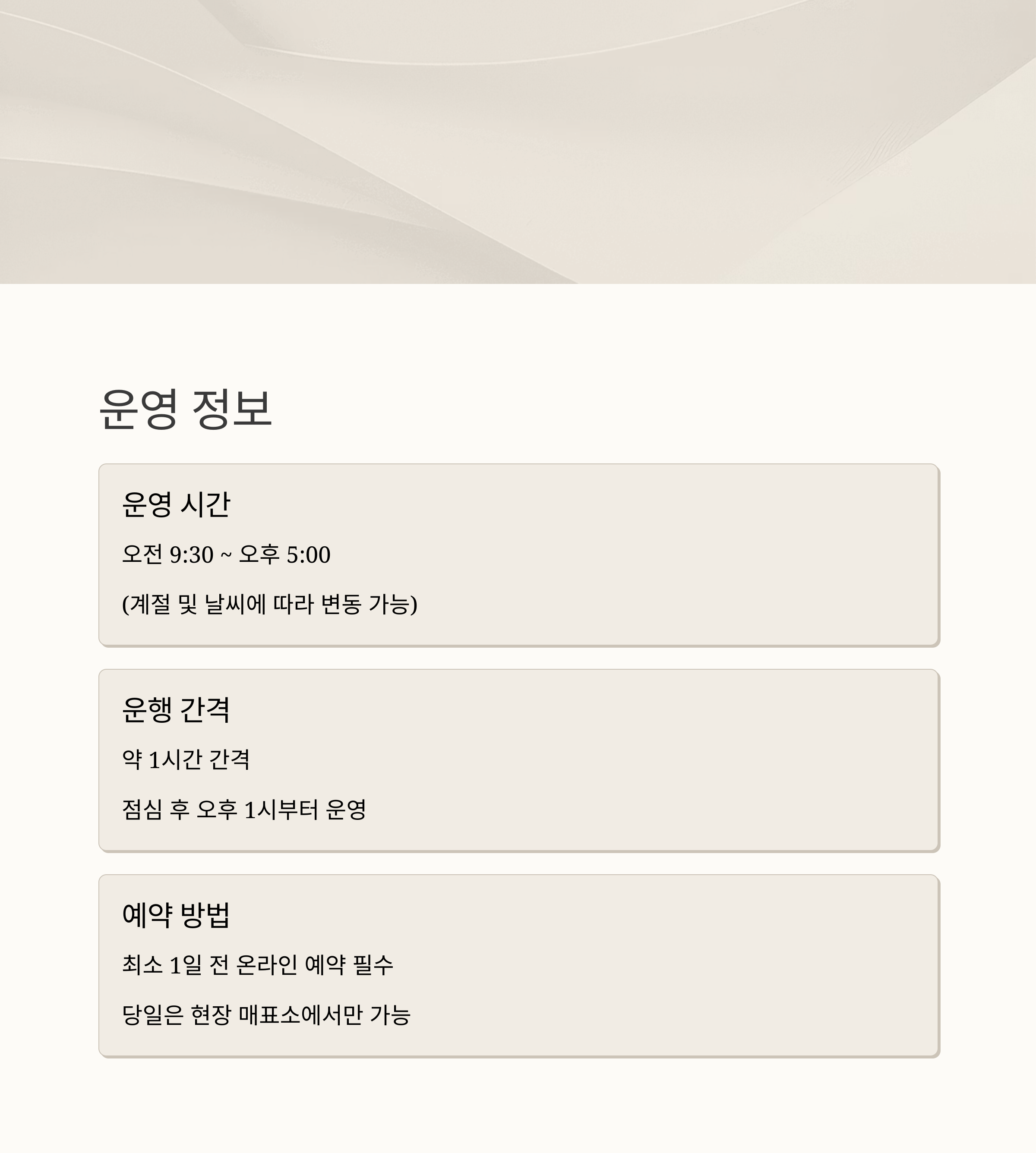 - 운영 시간: 오전 9시 30분 ~ 오후 5시 (계절 및 날씨에 따라 변동 가능)