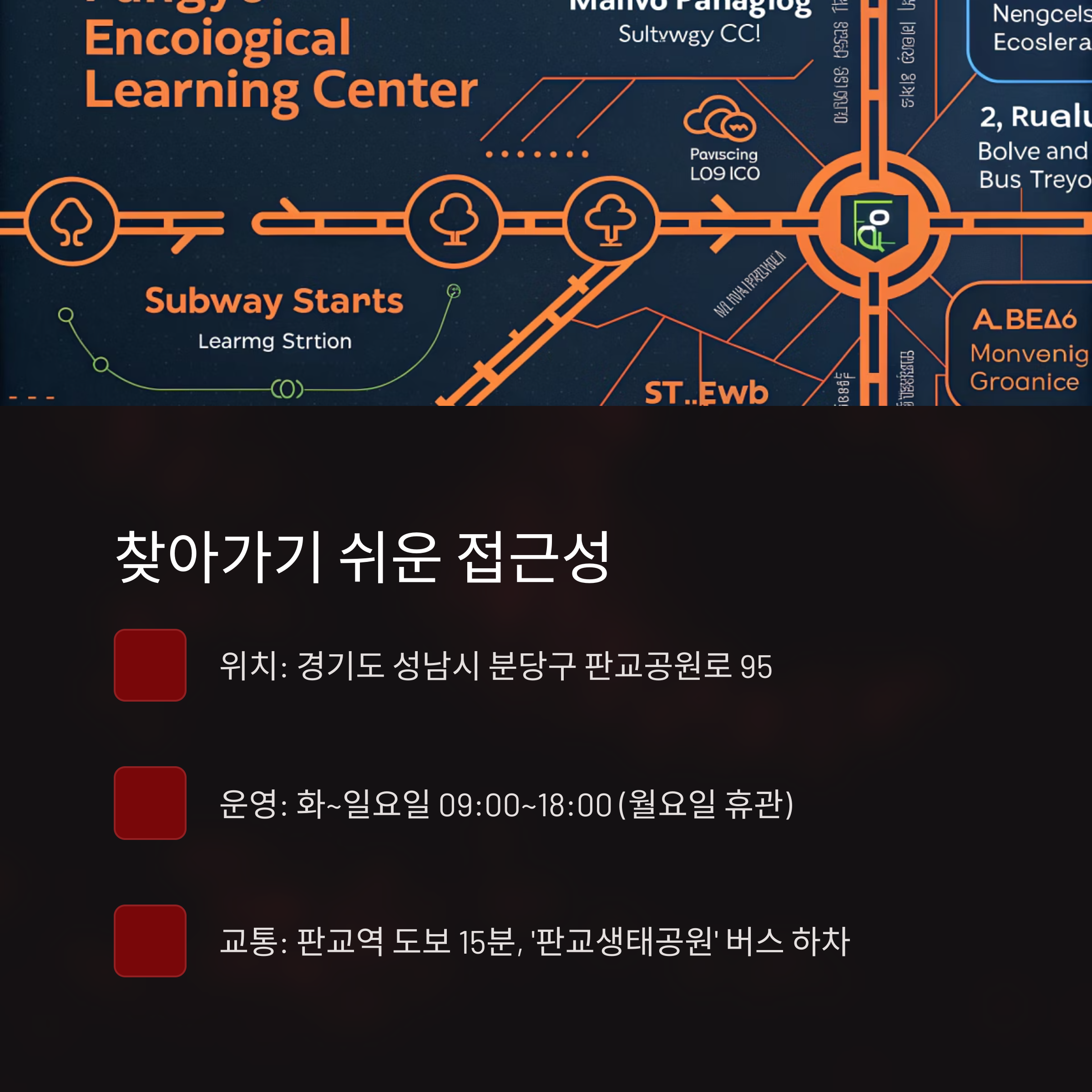 버스 이용 시 ‘판교생태공원’ 또는 ‘운중도서관’ 정류장에서 하차하면