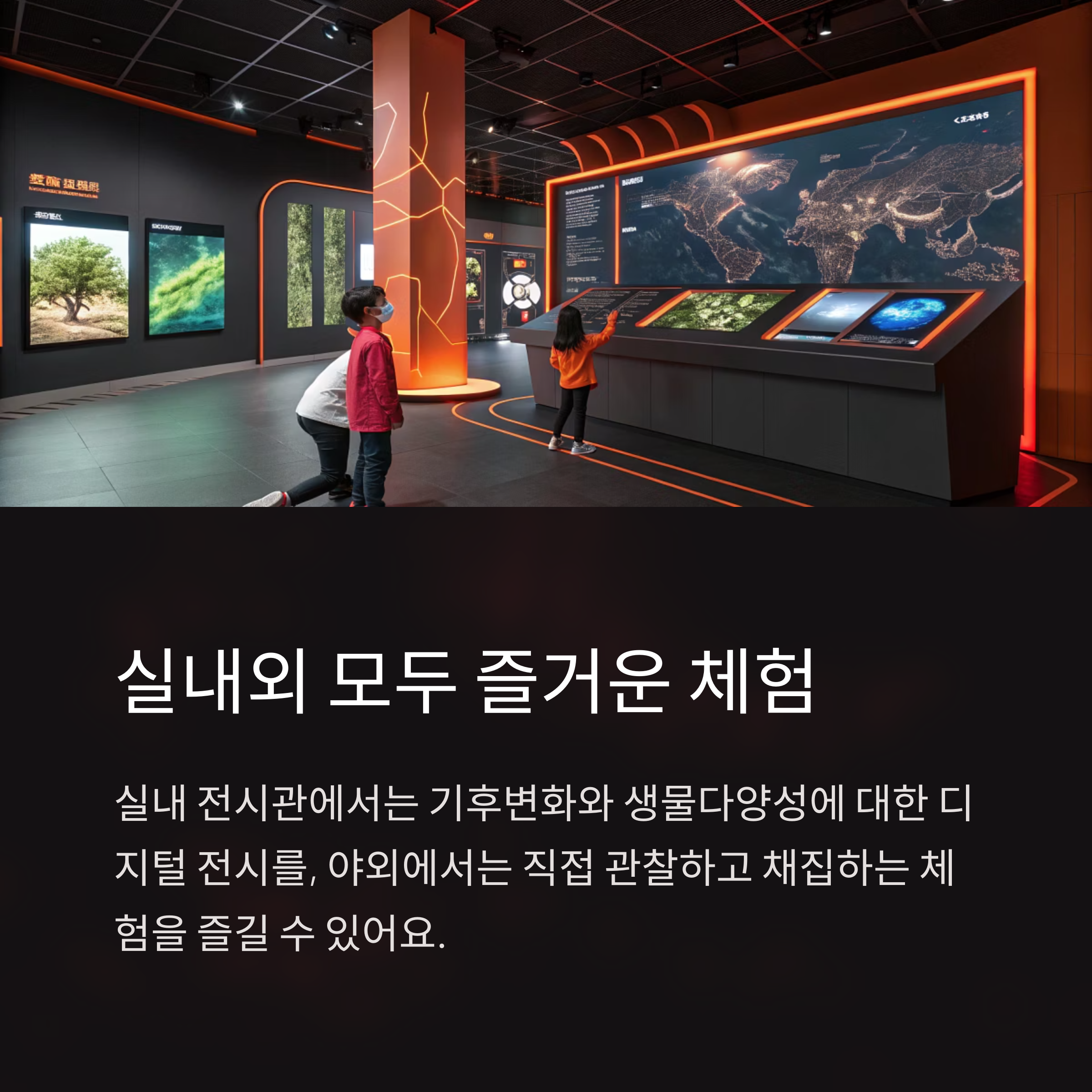 실내 전시관에서는 기후 변화, 생물 다양성, 자원 순환에 대한