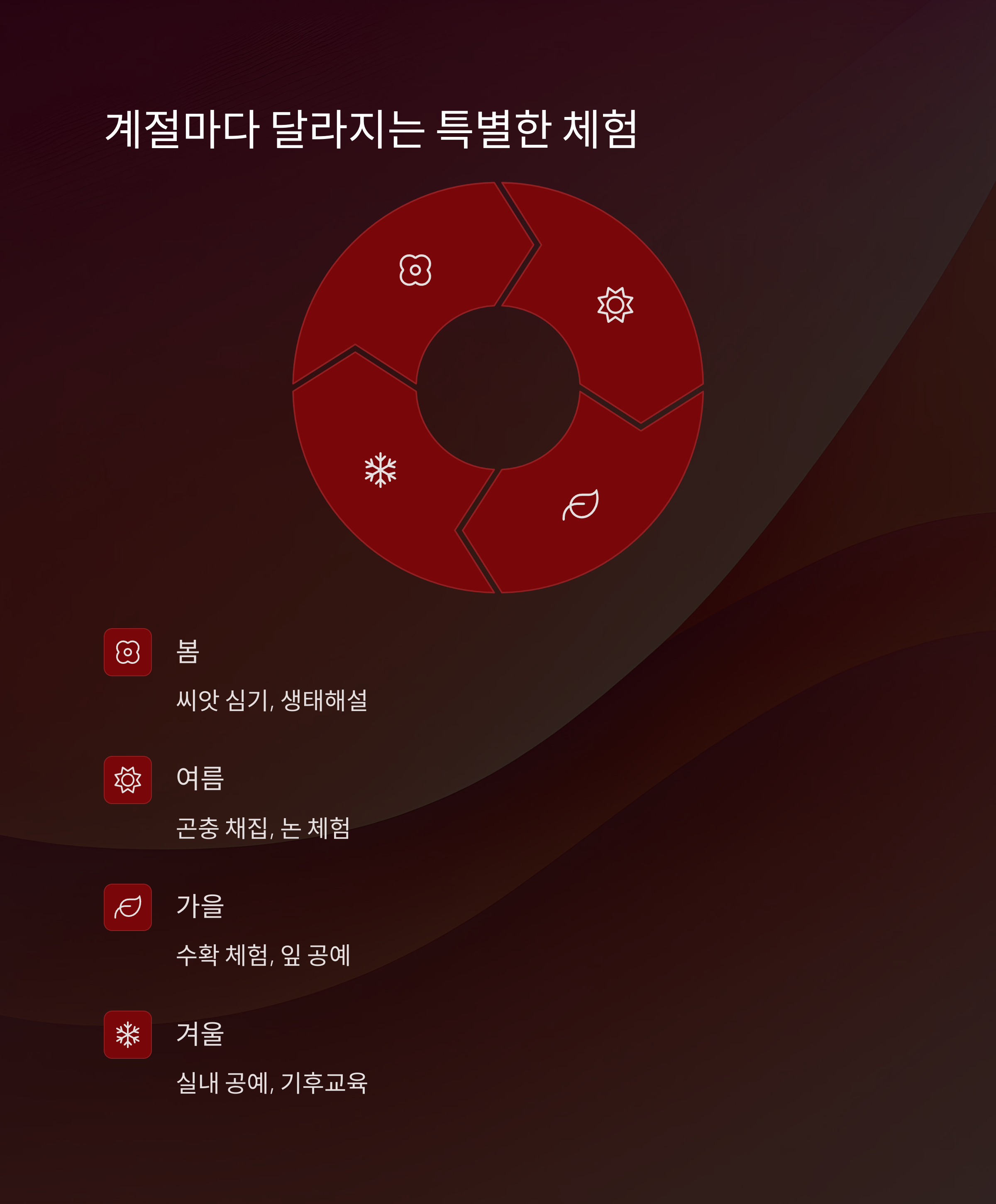 사계절 자연의 흐름을 따라 다양한 활동이 이어집니다.