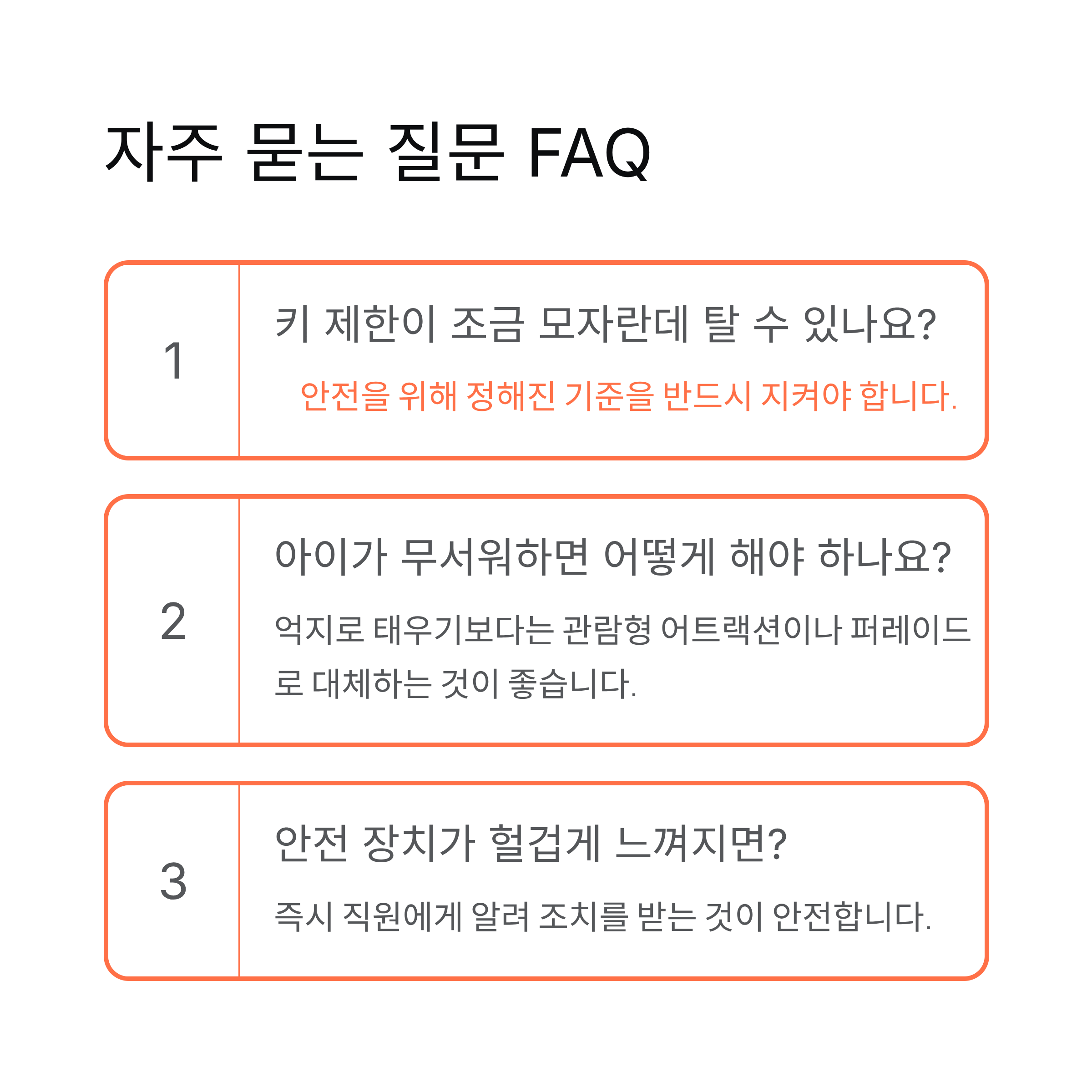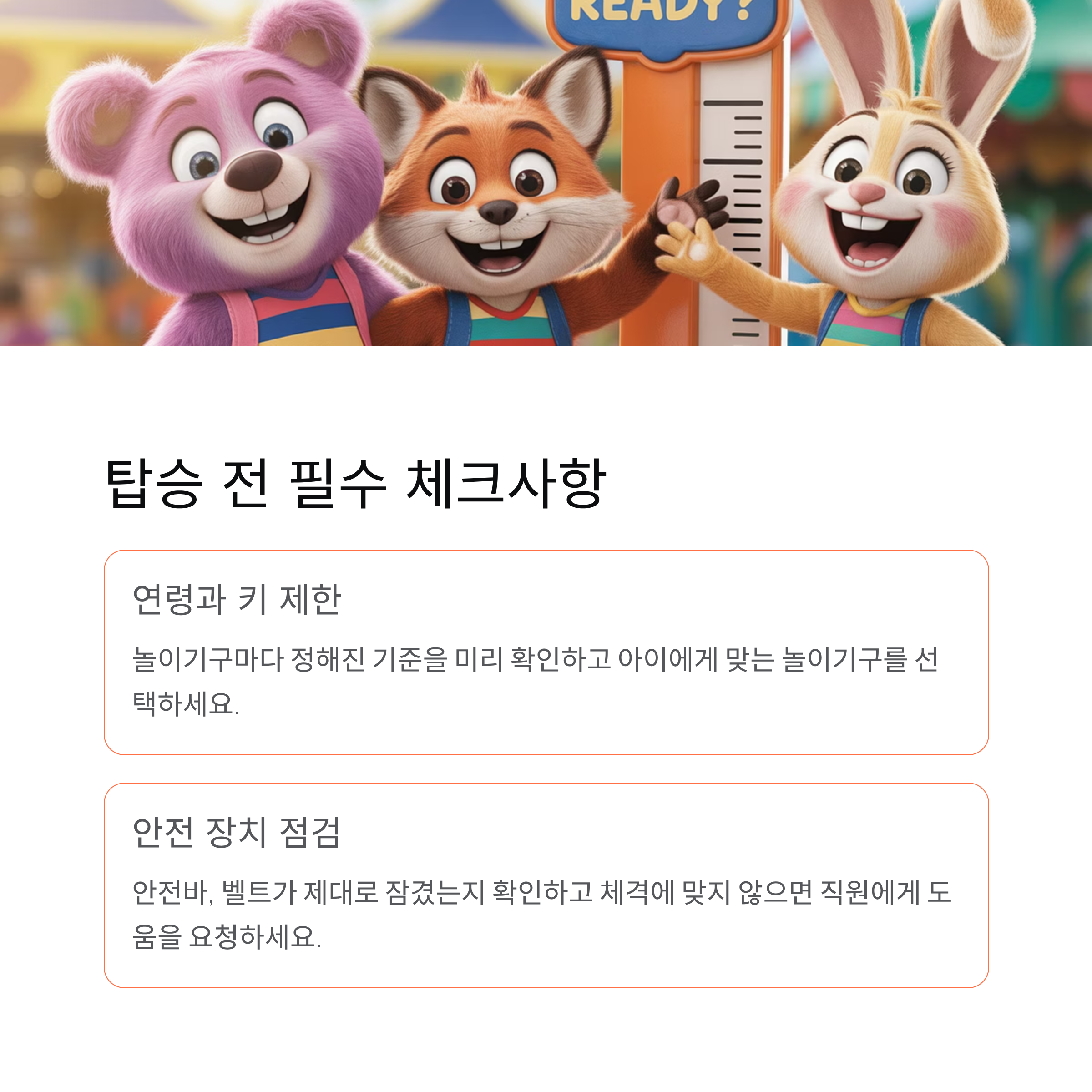 입장 전에 미리 확인하고 아이에게 맞는 놀이기구를 선택하면 불필요한 위험을 줄일 수 있습니다.