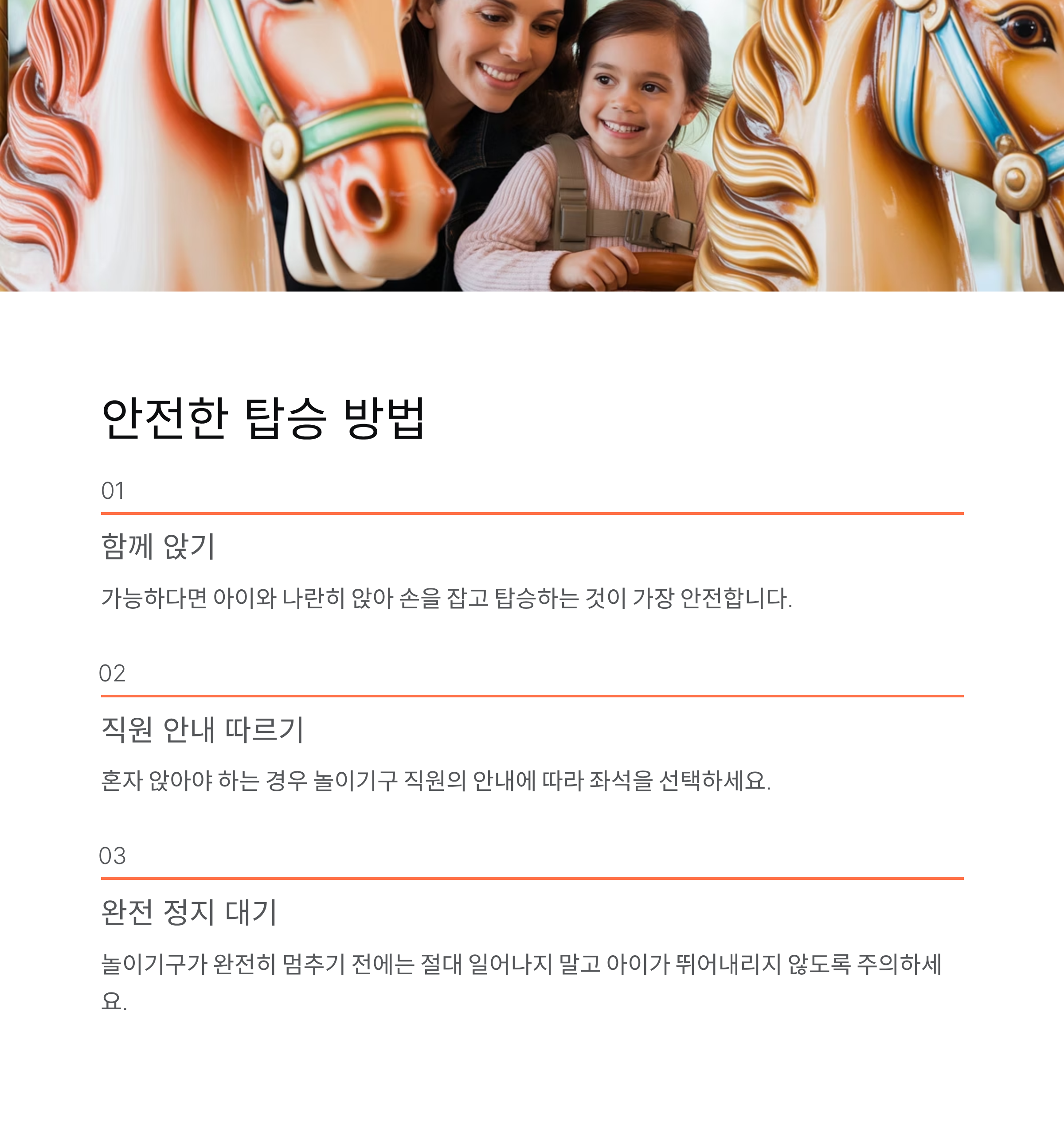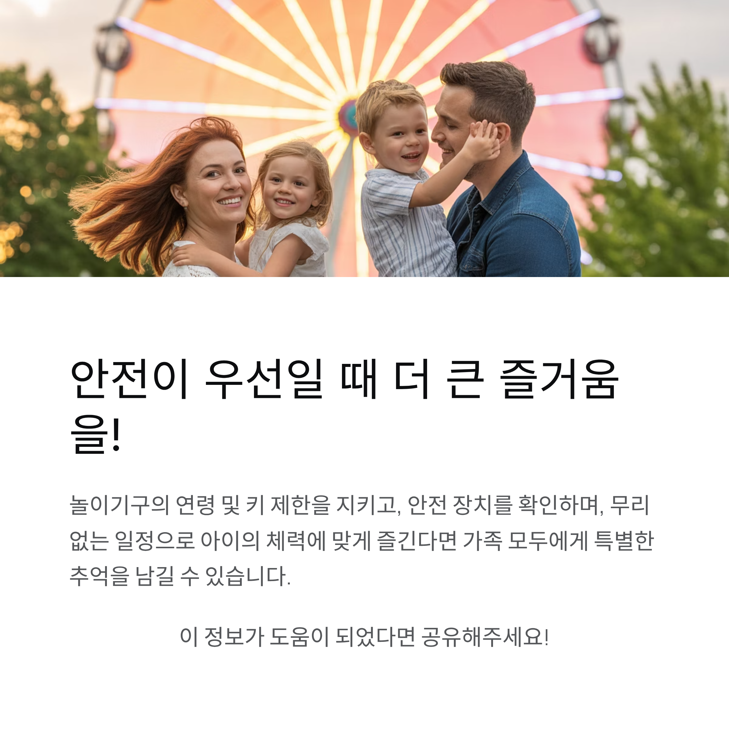 하지만 즐거움만큼 중요한 것이 바로 안전입니다. 아이와 함께 놀이기구를 탈 때는 연령과 신체 조건을 고려하고, 기본 안전 수칙을 지키는 것이 필요합니다.