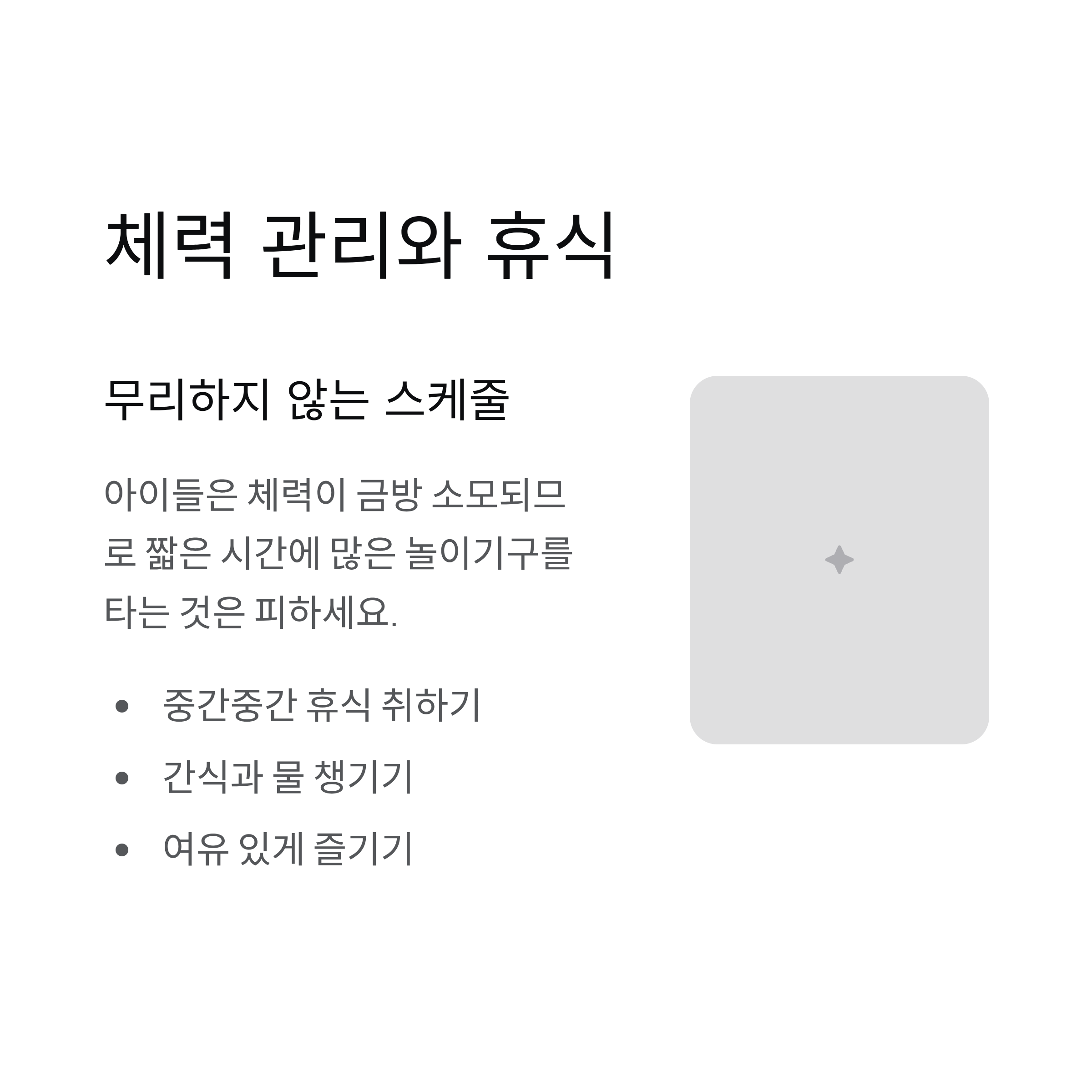 아이들은 체력이 금방 소모되기 때문에 짧은 시간에 많은 놀이기구를 타는 것은 피하는 것이 좋습니다.