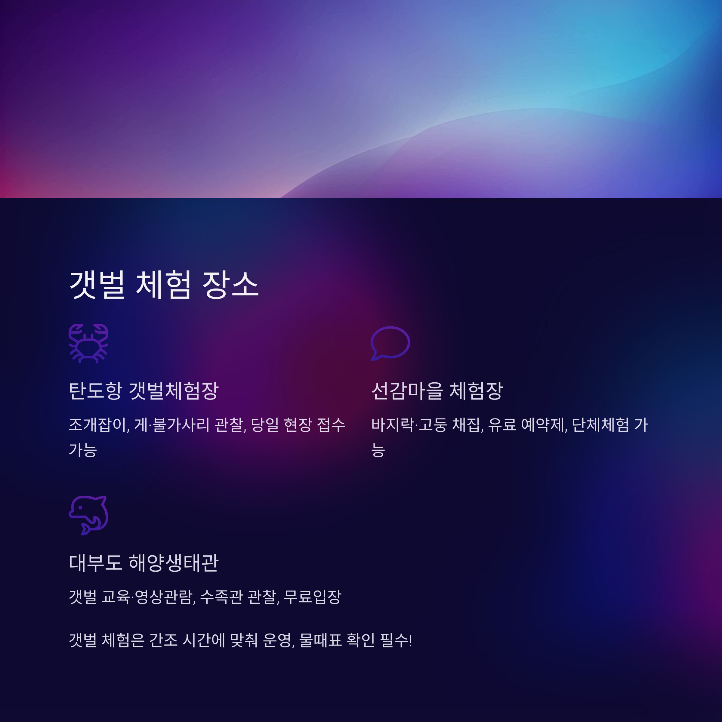 | 탄도항 갯벌체험장 | 조개잡이, 게·불가사리 관찰, 갯벌놀이 | 탄도항 인근, 당일 현장 접수 가능 |