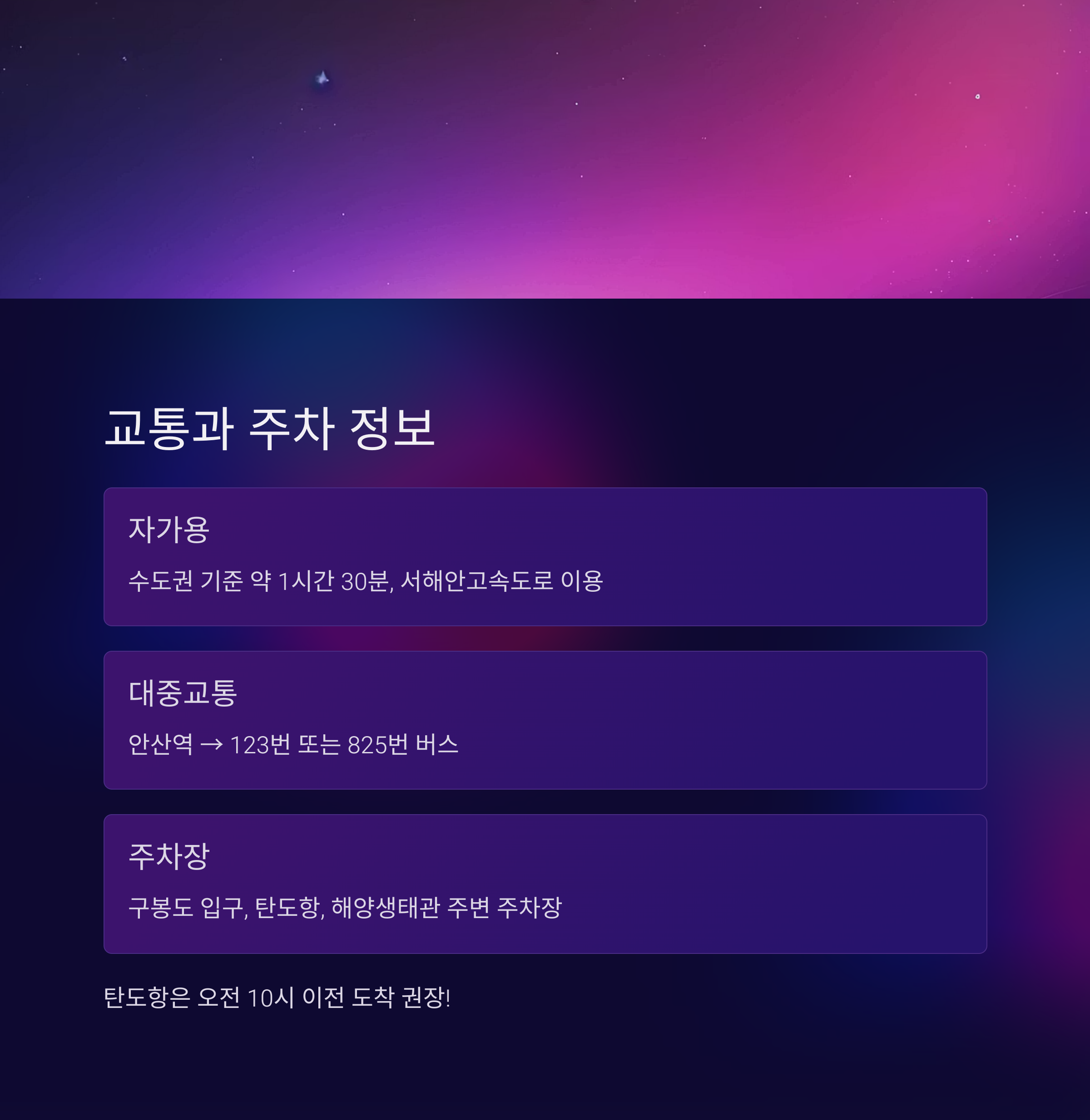 | 주차장 | 구봉도 입구, 탄도항, 해양생태관 주변 무료/유료 주차장 운영 |