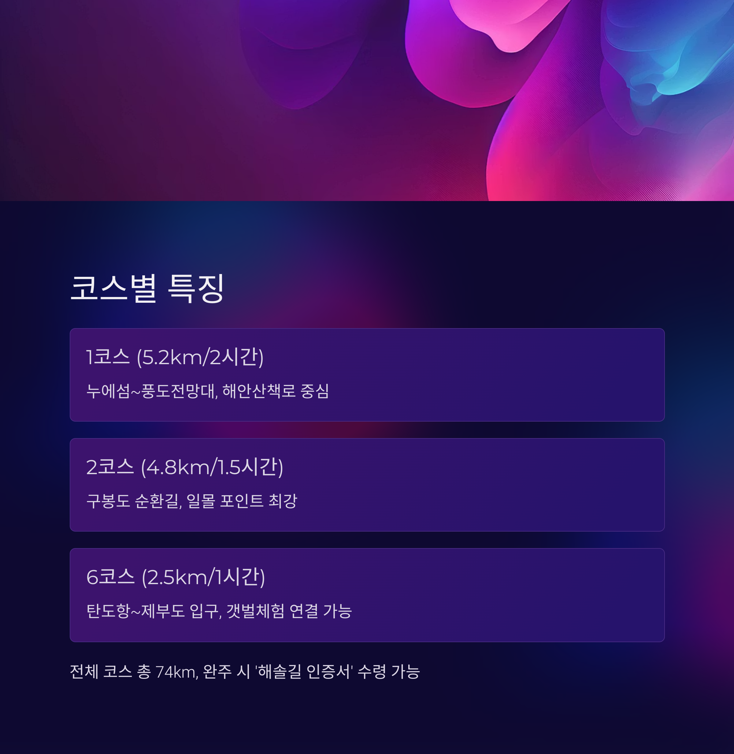 | 전체 코스 | 총 74km (7코스 합계) | 완주 시 ‘해솔길 인증서’ 수령 가능 |