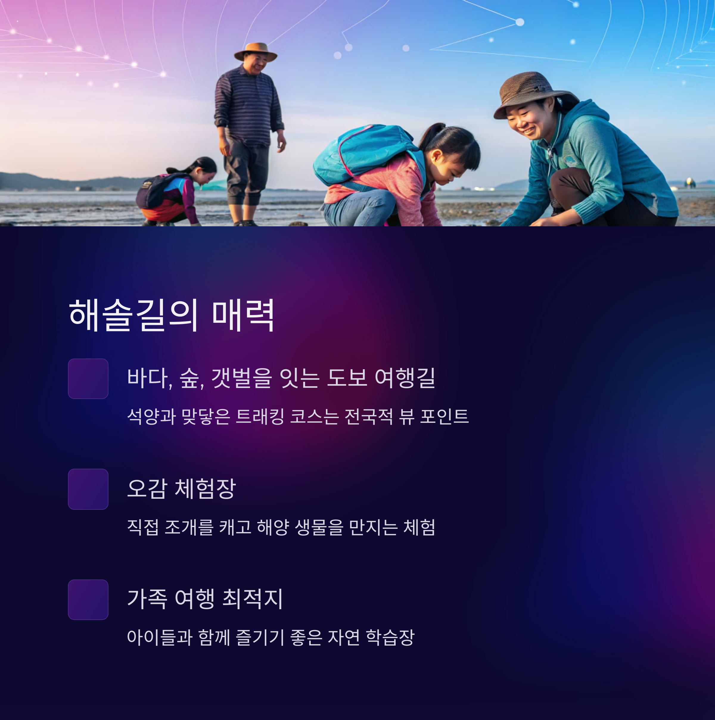 특히 해질 무렵 석양과 맞닿은 트래킹 코스는 전국적으로도 손꼽히는 뷰 포인트이며 아이들과 함께 즐기는 갯벌 체험장은 직접 조개를 캐고 해양 생물을 만지는 오감 체험장으로 인기입니다