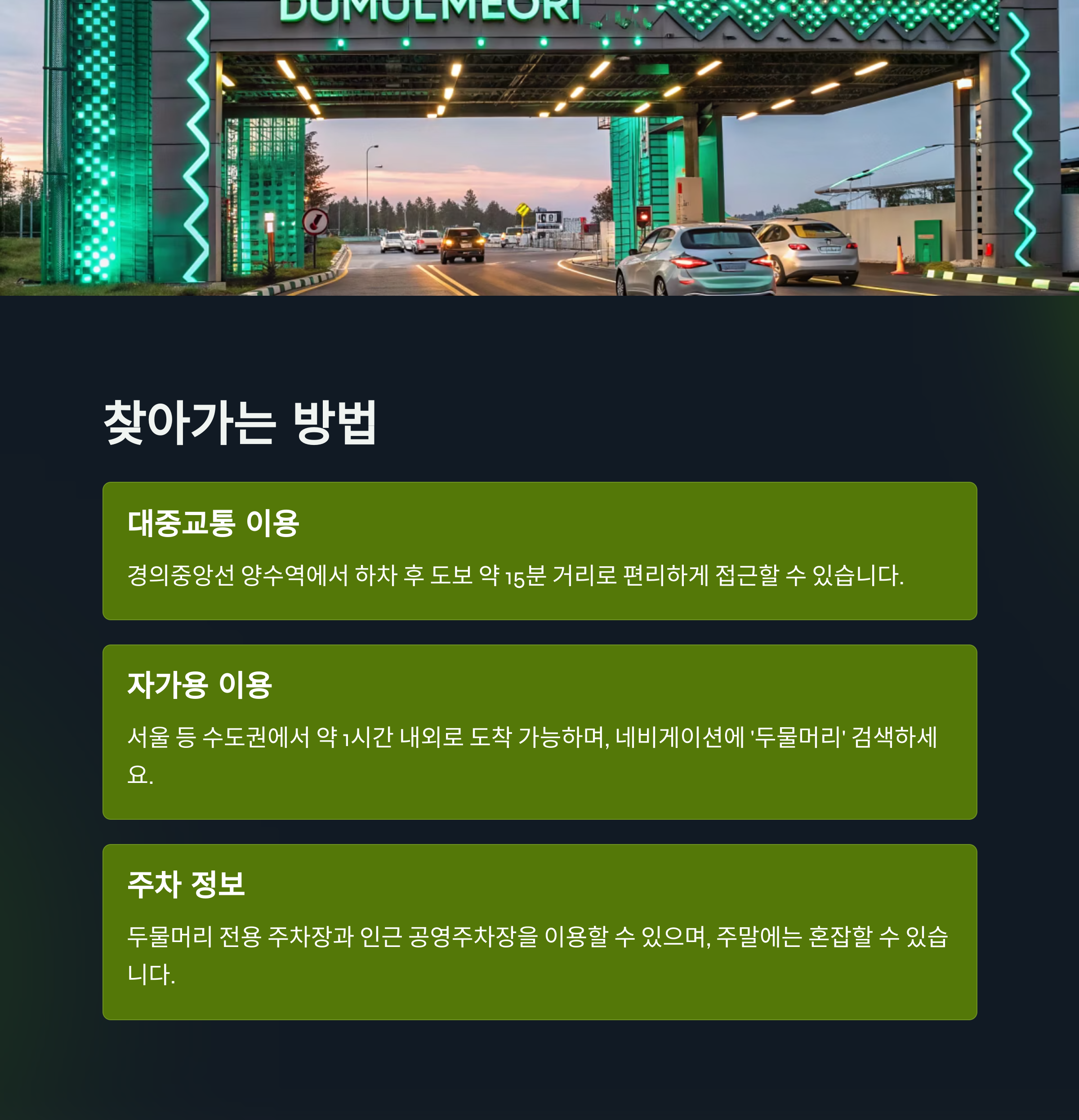 지하철 경의중앙선을 이용해 양수역에 내리면 도보로 10분 정도 소요됩니다.