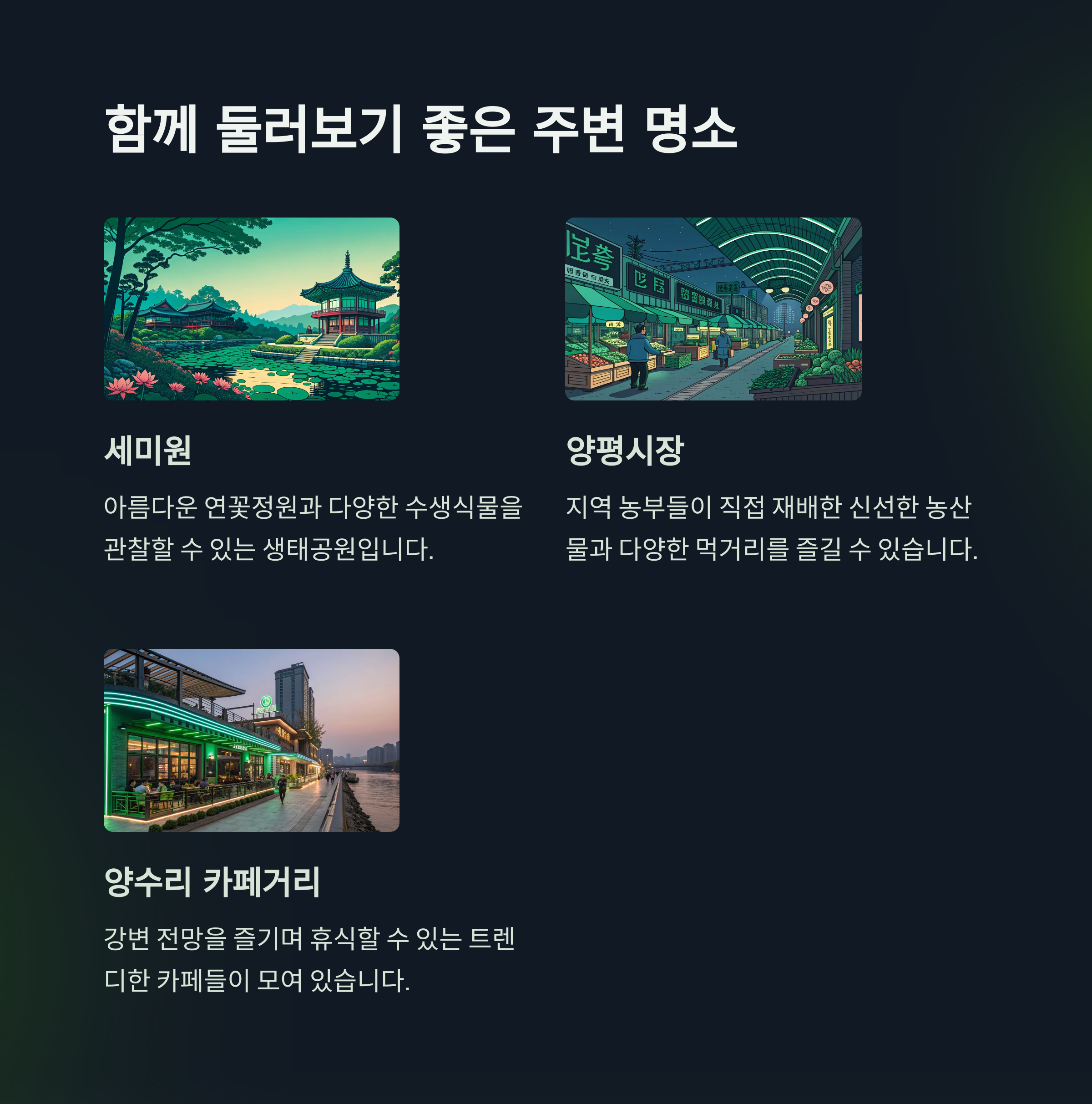 양평 두물머리만 보고 돌아가기 아쉽다면 근처 명소들도 함께 들러보세요.