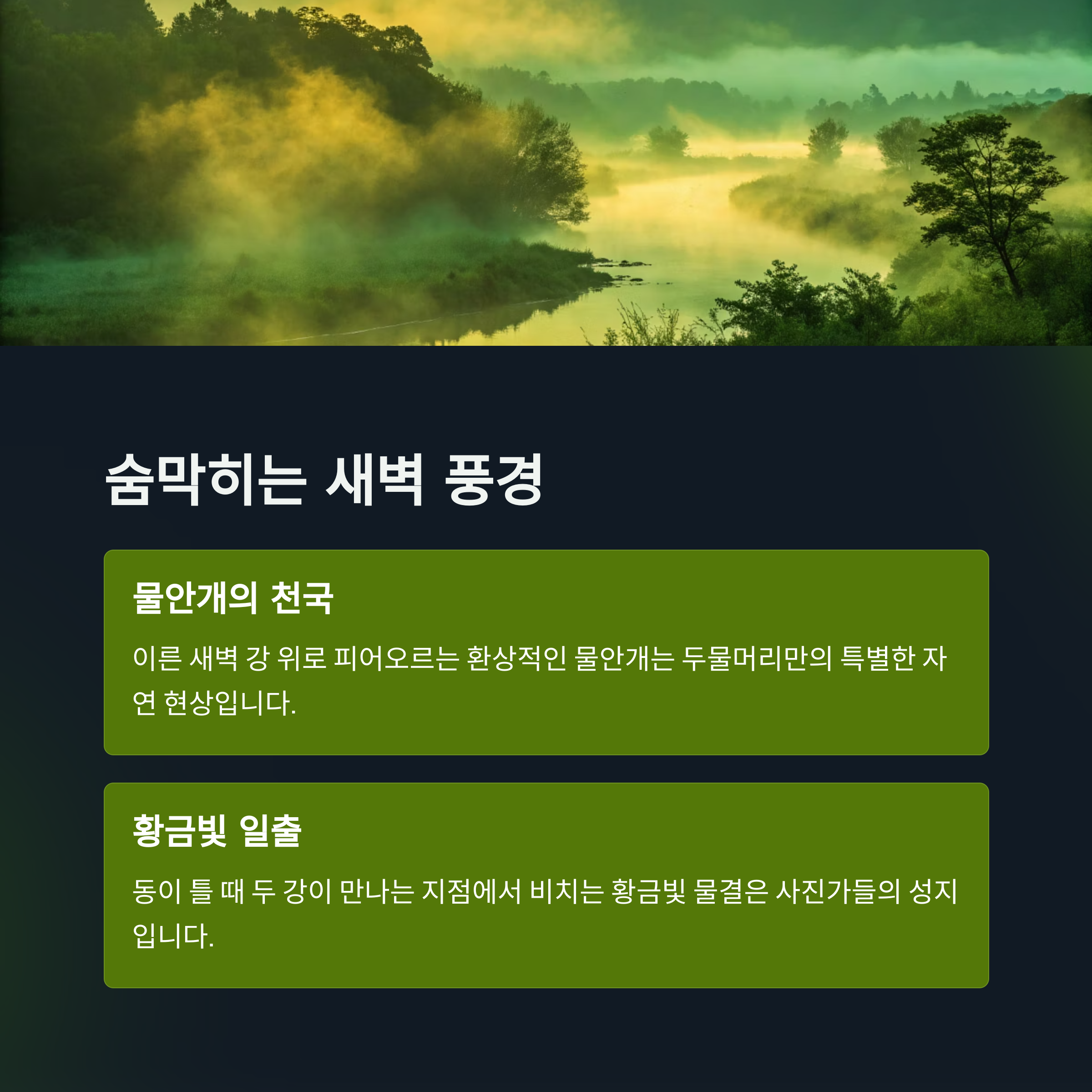 특히 해가 떠오르기 직전, 강 위를 덮은 하얀 안개가 만들어내는 신비로운 장면은 말로 표현하기 어렵습니다.