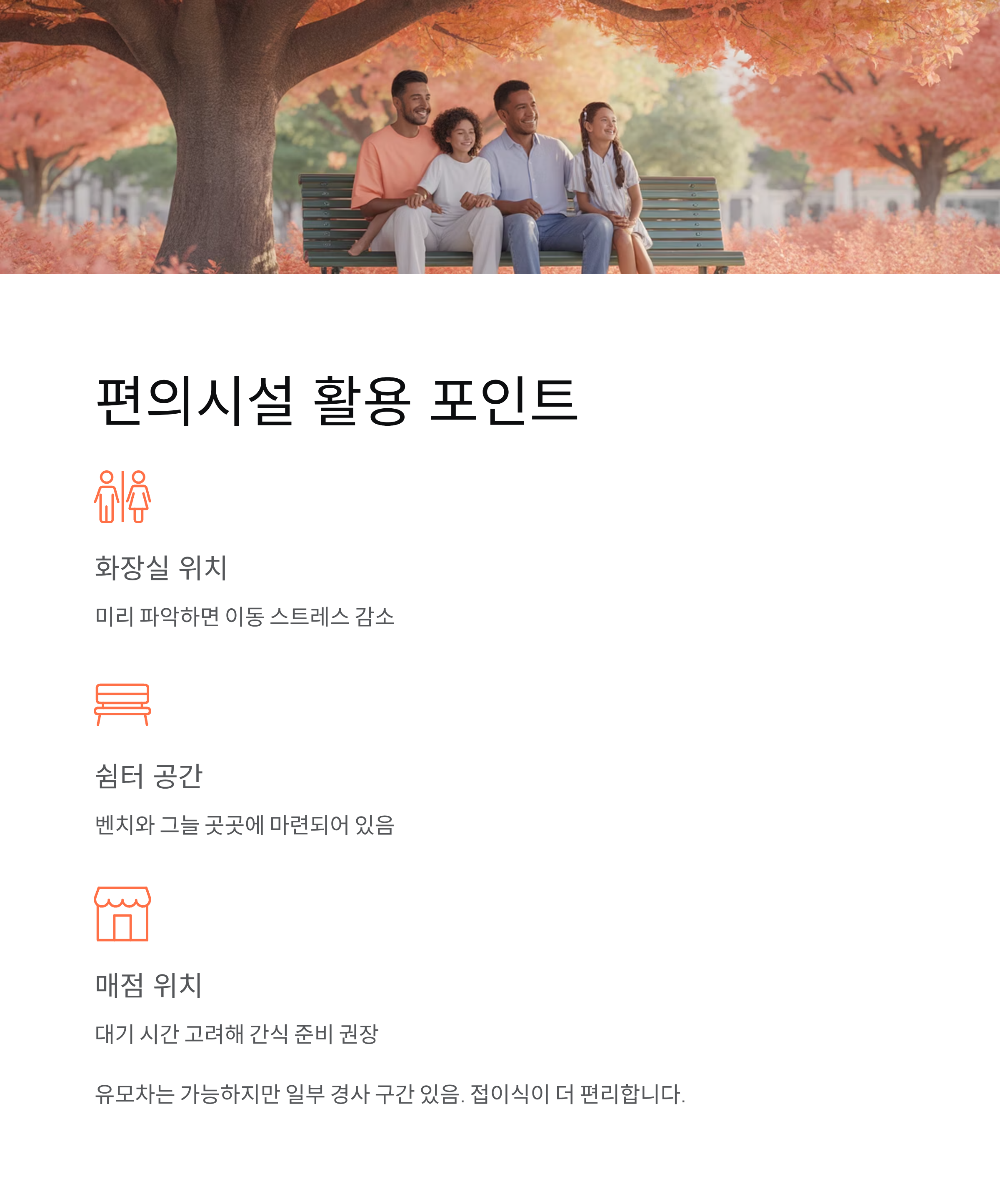 화장실, 쉼터, 매점 위치를 미리 파악해 두면 훨씬 편합니다. 특히 아이와 함께라면 화장실 위치를 알고 있는 것만으로도 이동 스트레스가 줄어듭니다. 벤치와 그늘 공간도 곳곳에 마련되어 있어 중간 휴식을 꼭 계획에 넣는 것이 좋습니다.