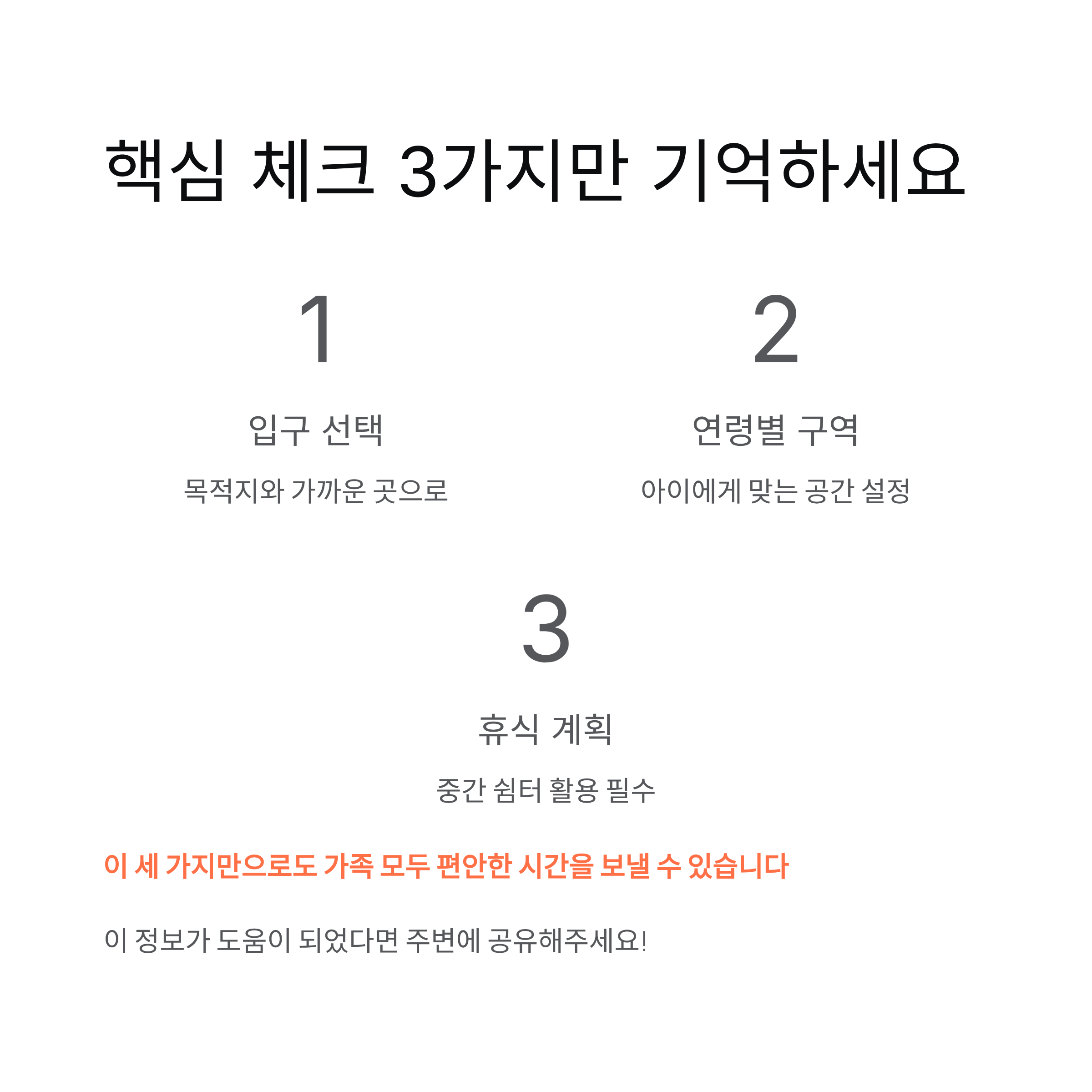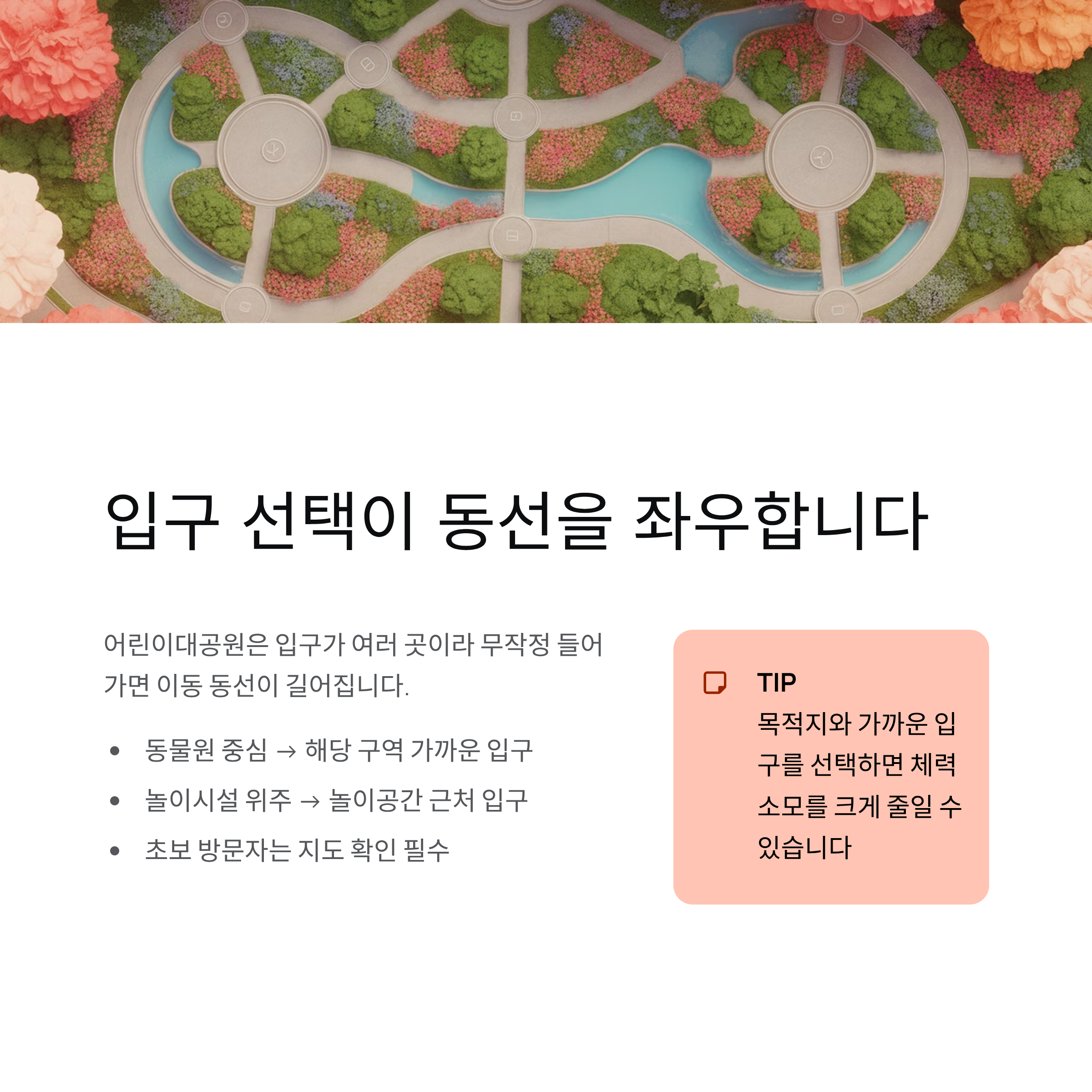 어린이대공원은 준비 없이 가도 즐길 수 있는 공간이지만, 초보 방문자라면 몇 가지 체크만으로도 체력 소모와 동선 혼란을 크게 줄일 수 있습니다. 입구 선택, 연령별 구역 설정, 휴식 계획 이 세 가지만 기억해도 가족 모두가 훨씬 편안한 시간을 보낼 수 있습니다.