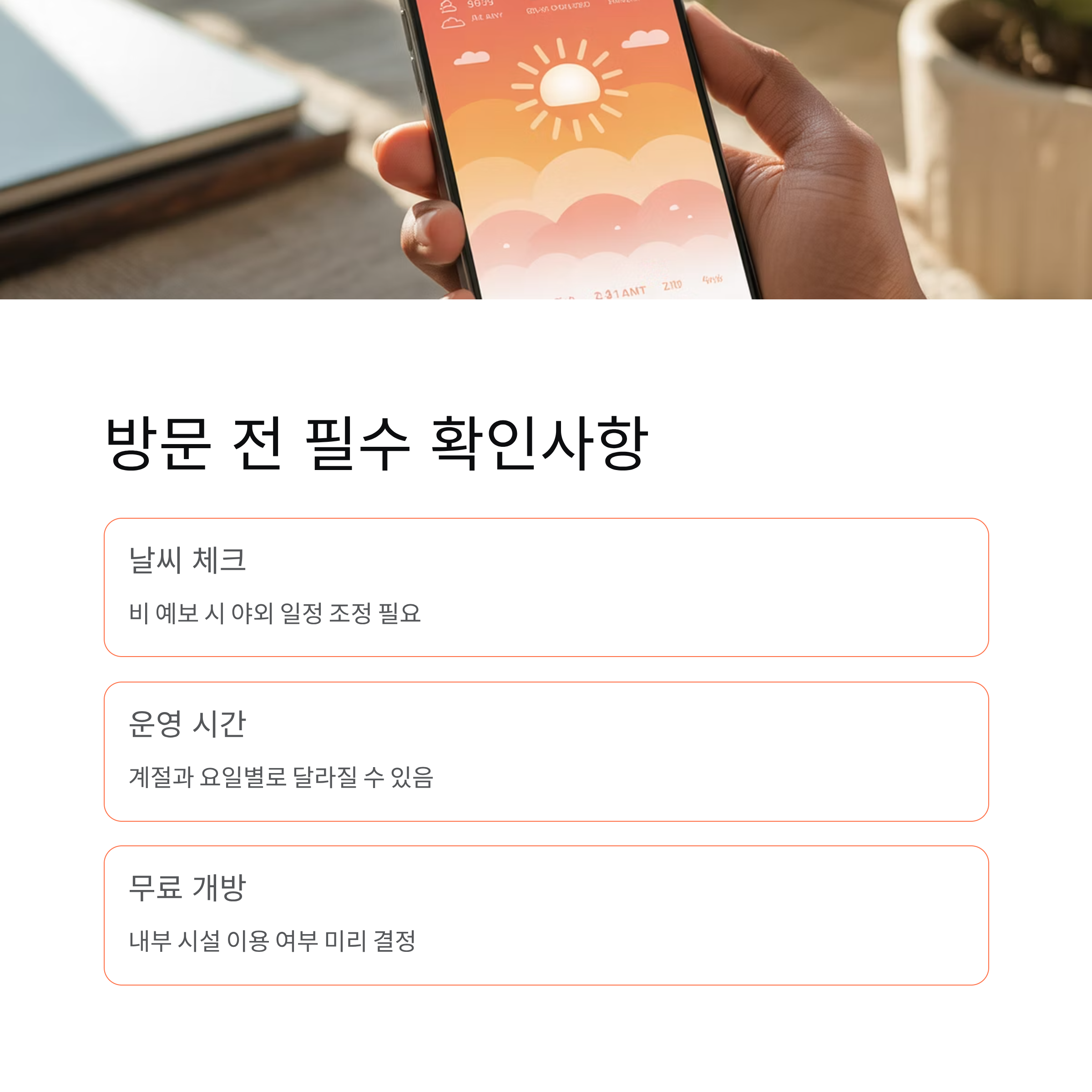 어린이대공원은 무료 개방이지만, 내부 시설 이용 여부에 따라 일정이 달라집니다. 방문 전 날씨 확인은 필수이며, 비 예보가 있다면 야외 일정 비중을 줄이는 것이 좋습니다. 운영 시간은 계절과 요일에 따라 달라질 수 있으므로 공식 정보 확인도 꼭 필요합니다.