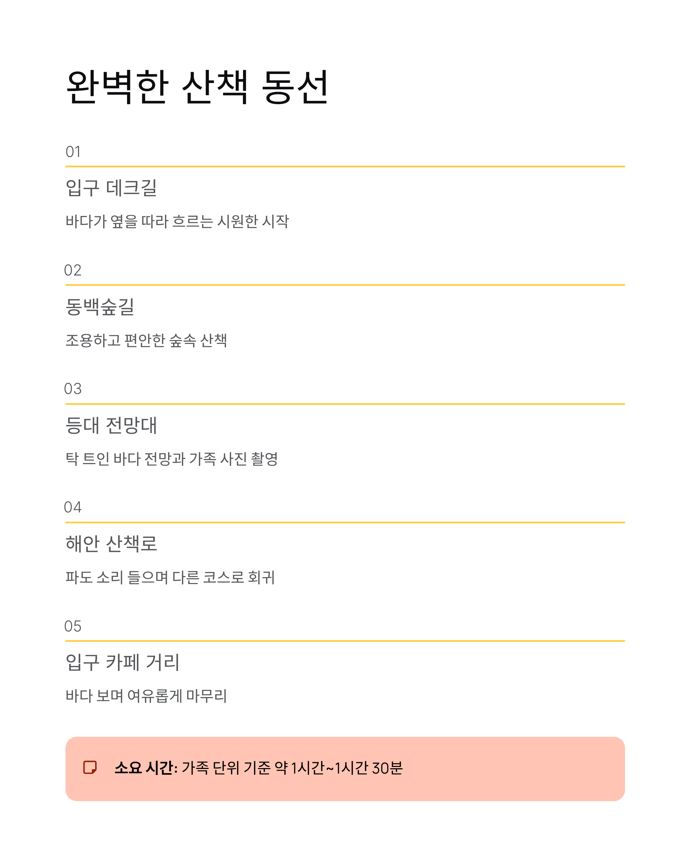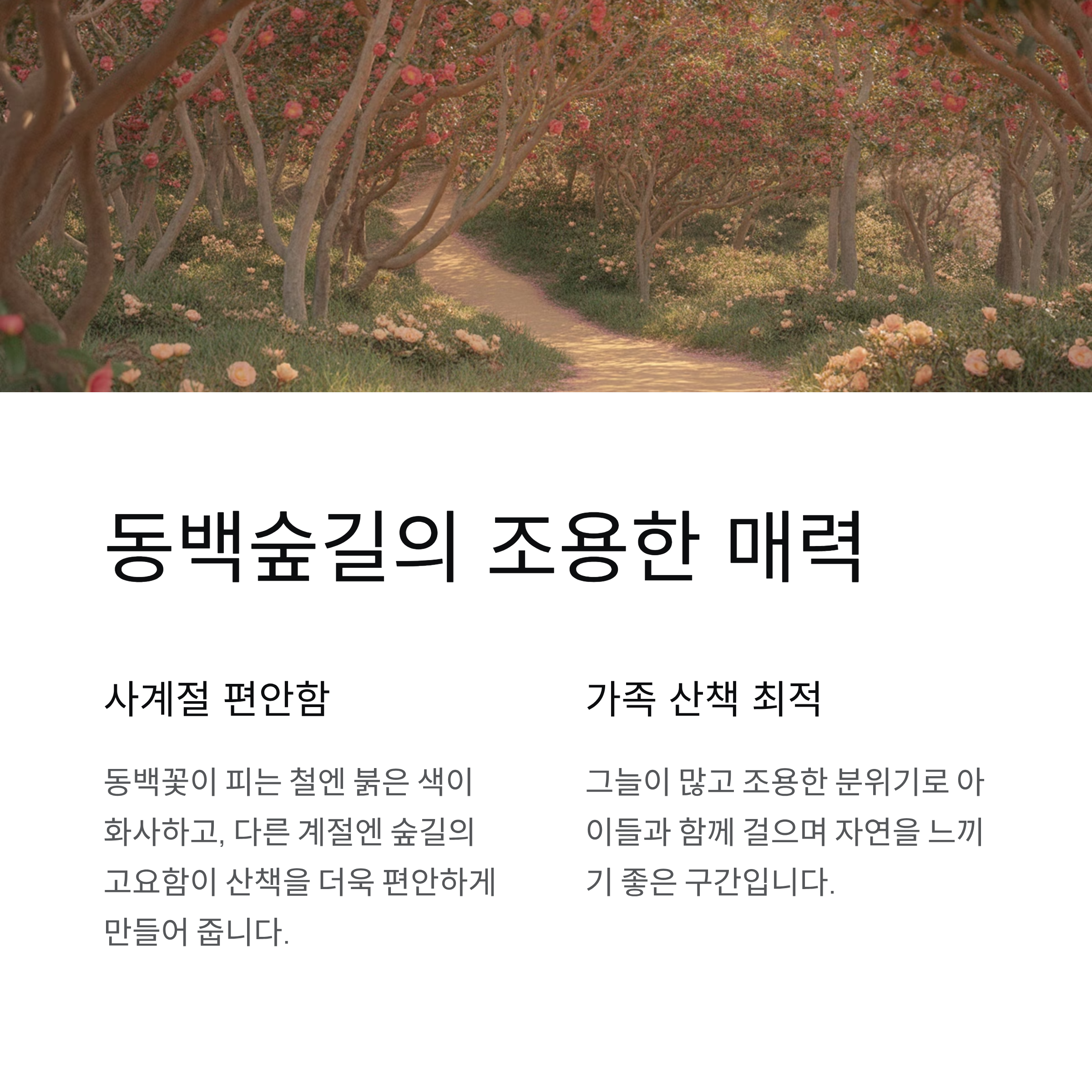 | 동백숲길 | 조용하고 그늘 많음 | 휴식과 사진 촬영 적합 |